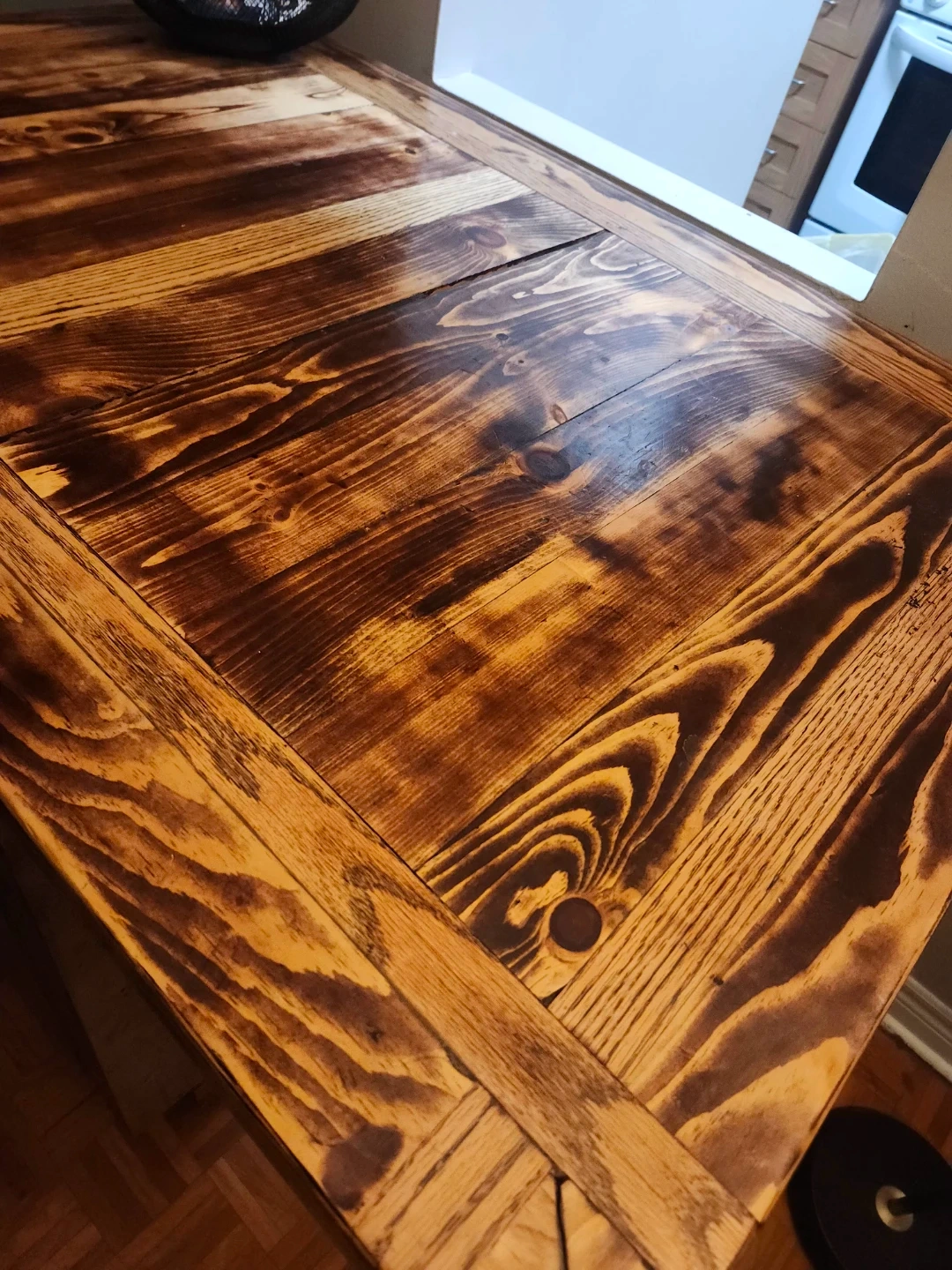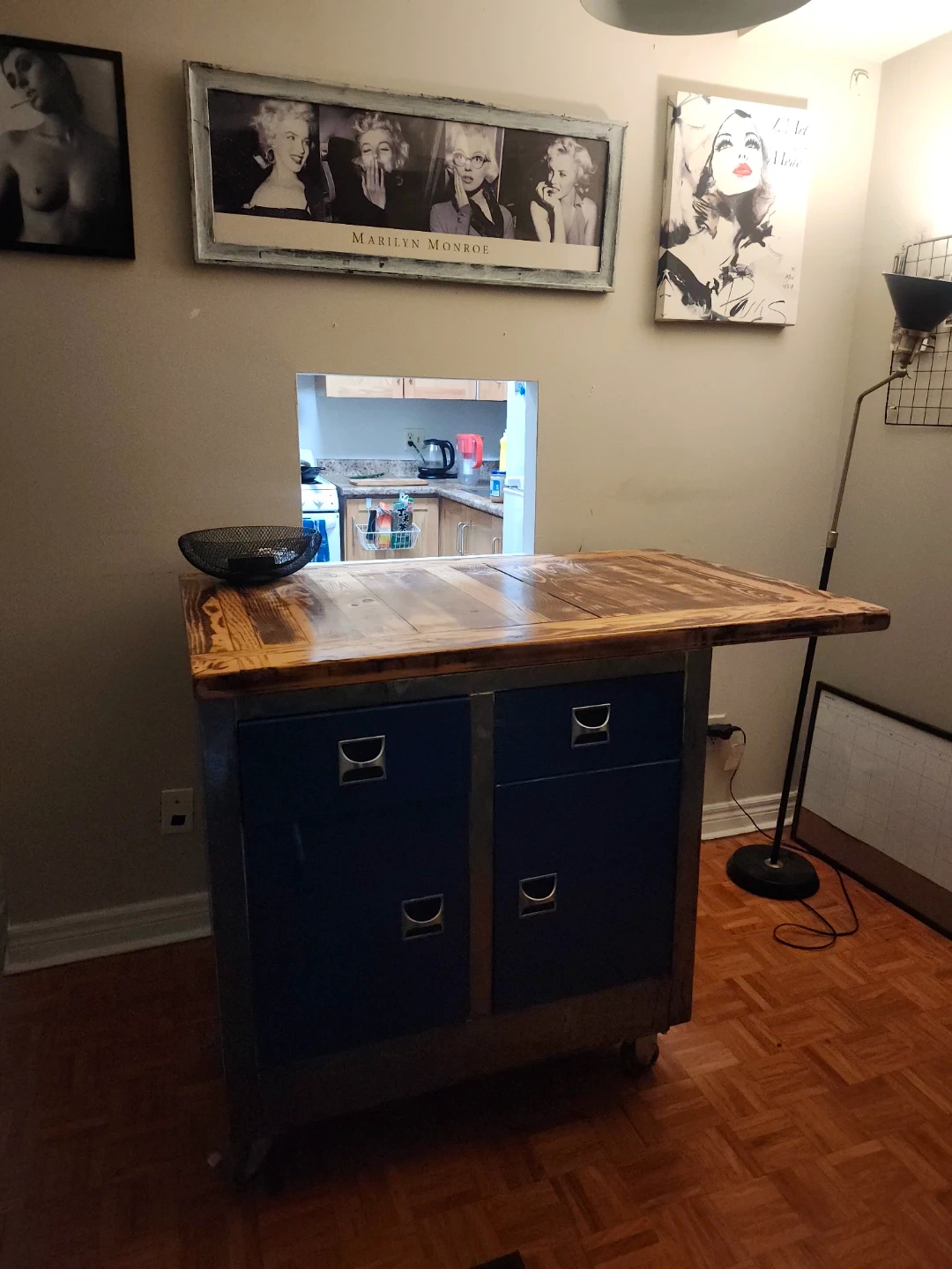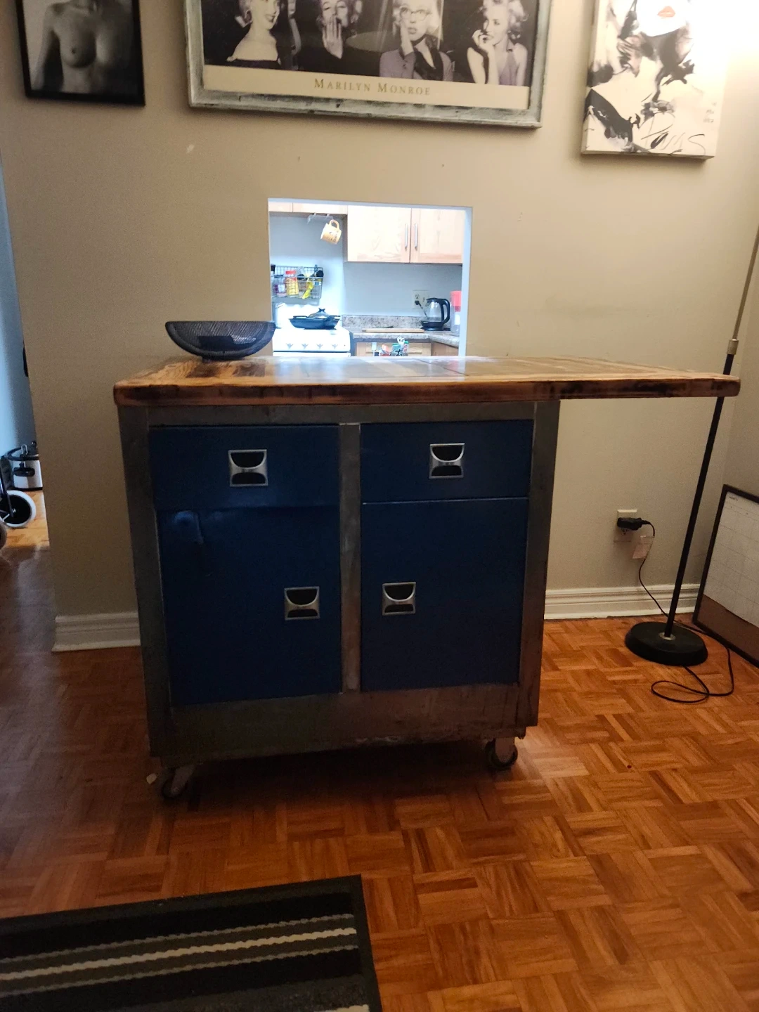 Selling a hand designed, kitchen island with a beautiful real wood top and stylish blue drawers on wheels! It's a unique piece that adds character to any kitchen. The drawers provide ample storage space, and the wood top is perfect for food preparation or casual dining. It's in great condition and ready for a new home! Also comes with an additional metal attachable metal leg in case you need xtra stability for a function. The wood top is 47" X 31", the cabinet is 31" height X 32" wide X 17" depth. The full height with the wheels is 35".