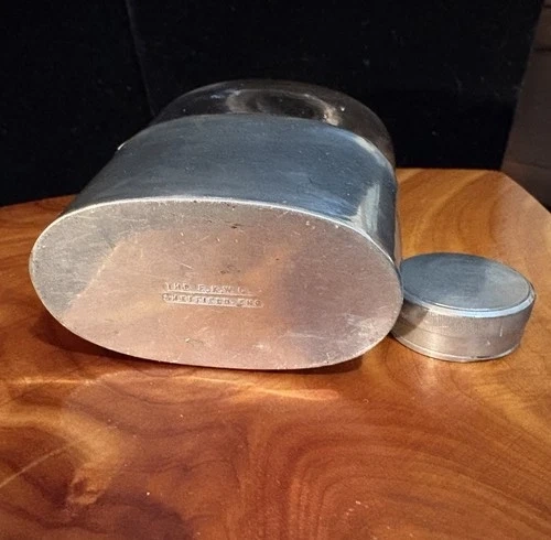 Experience a piece of history with this Antique Hip Flask, a genuine E.K.W & CO creation from the turn of the century, roughly spanning from 1890 to 1920. Crafted with precision this flask reflects the sophistication of its era. Its 4 oz. capacity is perfect for a refined toast and adds a vintage touch to your collection. The flask showcases a classic silver plate and glass design, and is a testament to the craftsmanship of EK Williams from Sheffield, England. An ideal acquisition for collectors and enthusiasts alike, this hip flask promises to be a distinguished and cherished addition to any assemblage. Please review photos; the flask has no chips or cracks but does show signs of wear. If you have any questions please don’t hesitate to ask. Thank you.