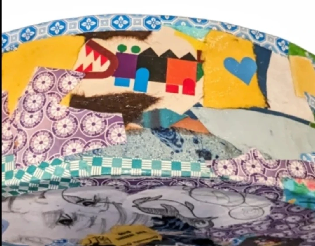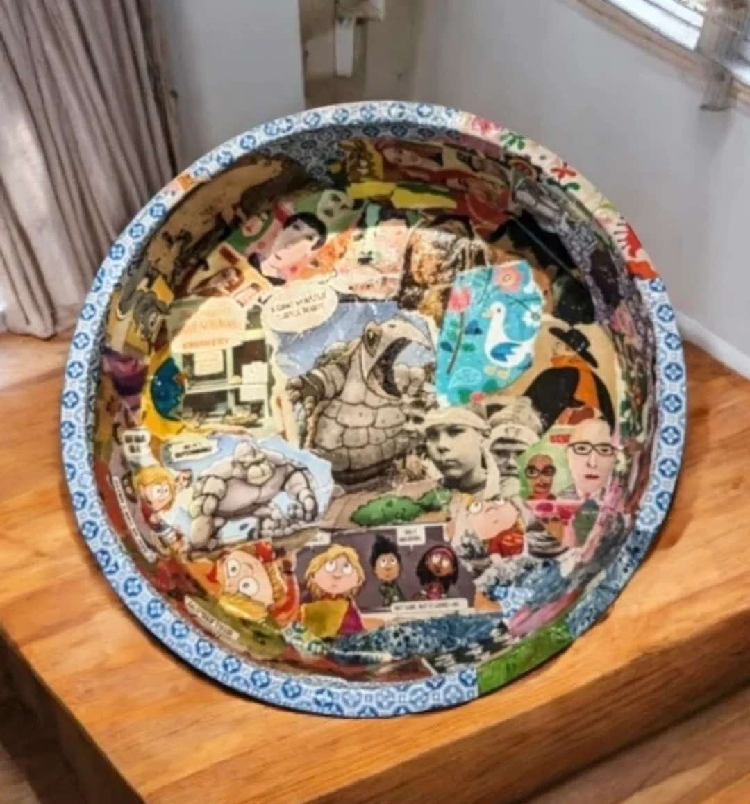 Entirely crafted with decoupage; This includes Original etchings, Watercolors, Marble paper, Photography, Fabric and hand picked color collage.