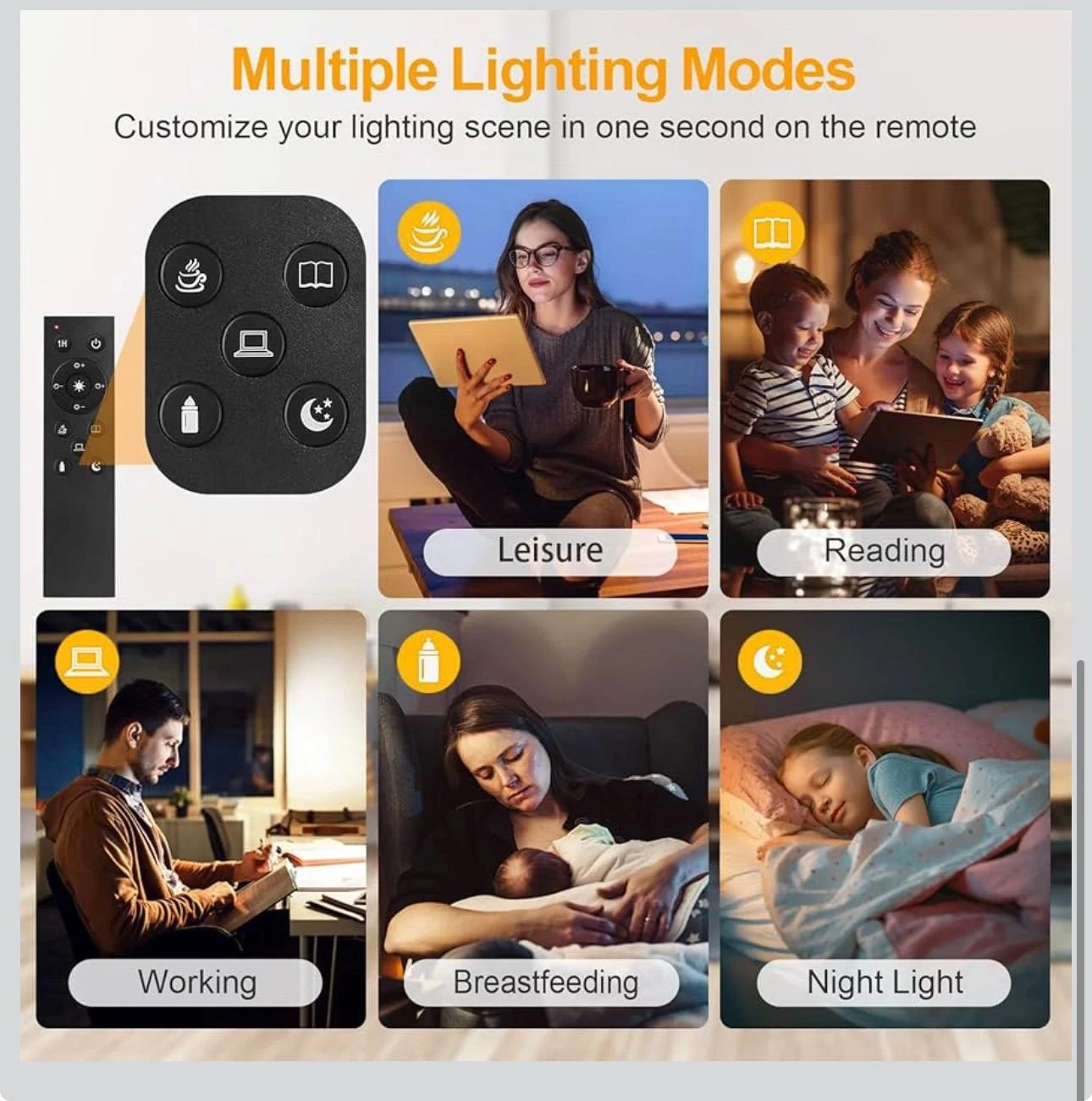 This floor lamp offers 4 color temperature settings and stepless dimmable brightness. Customize your lighting scene with different modes like leisure, reading, working, breastfeeding, and night light. It comes with a remote for easy control. Perfect for any room needing adjustable lighting!