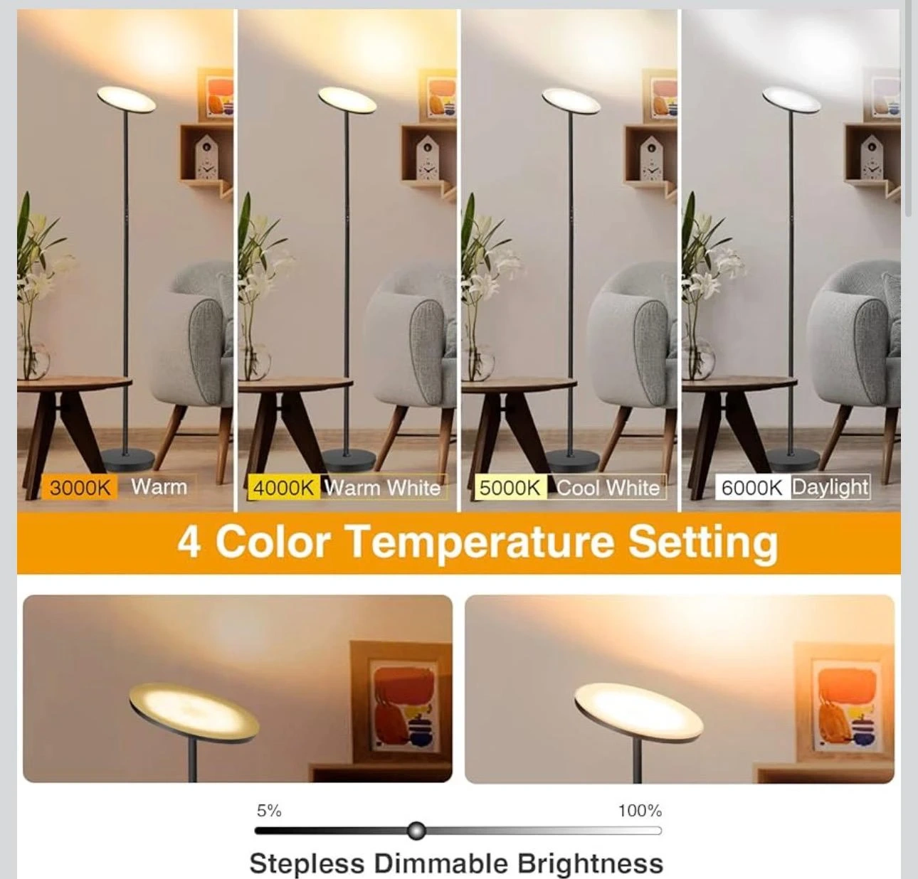 This floor lamp offers 4 color temperature settings and stepless dimmable brightness. Customize your lighting scene with different modes like leisure, reading, working, breastfeeding, and night light. It comes with a remote for easy control. Perfect for any room needing adjustable lighting!