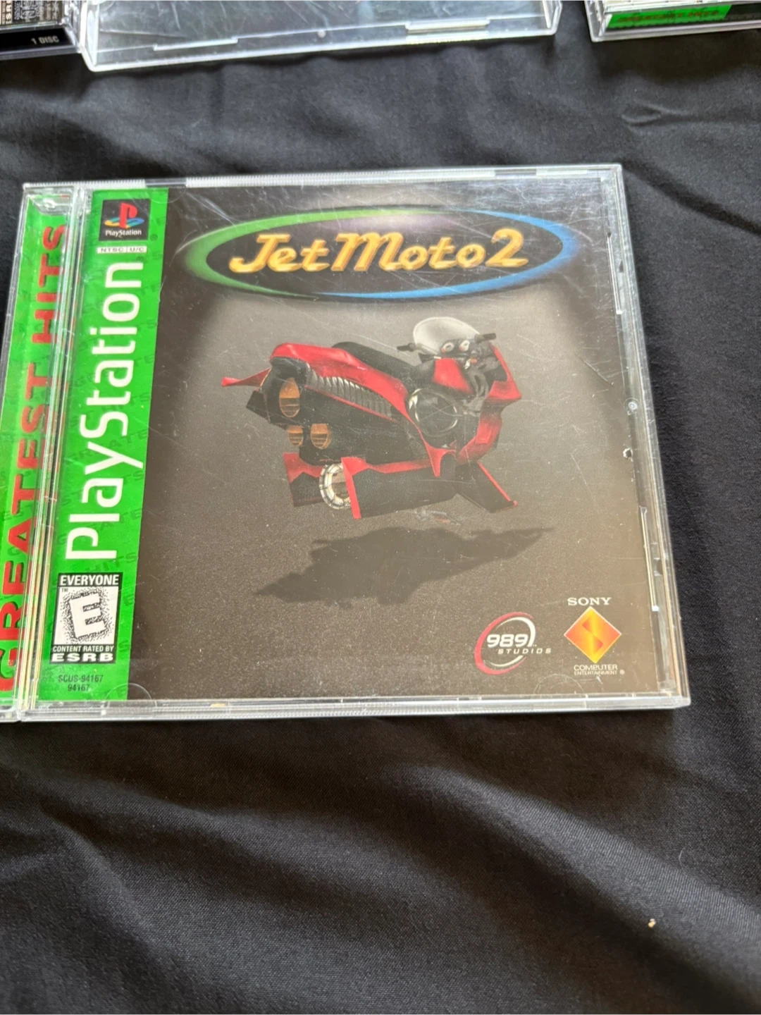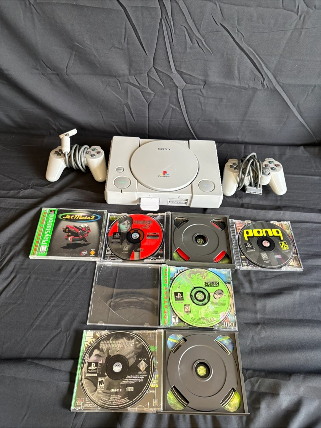 This bundle includes a Sony PlayStation 1 console, two controllers, and several games. Games included are Jet Moto 2, Resident Evil 2, Syphon Filter, Pong and Twisted Metal 4. It's a great collection for any retro gaming enthusiast!