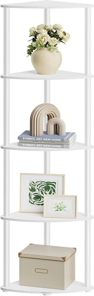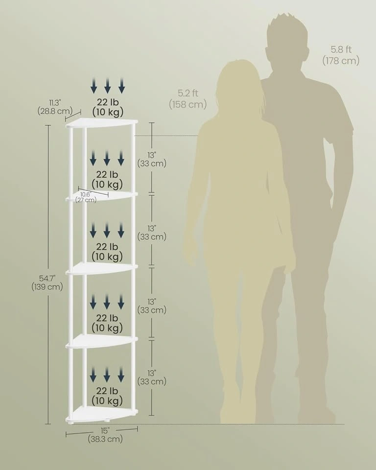 Set up this corner shelf in just about 10 minutes—no tools required. It's a versatile shelf that fits perfectly in any room like the living room, bedroom, study, bathroom, hallway, kitchen, or on the balcony. It measures 15"D x 10.6"W x 54.7"H and offers plenty of storage space while taking up little floor space. Crafted from steel and scratch-resistant particleboard, this shelf is stable and durable, capable of holding up to 22 lb per tier (110 lb in total). It features 4 feet for enhanced stability, alongside an anti-tip kit for added safety. Boasting sleek lines and a snow white hue, this corner shelf unit has a minimalist charm and will complement various home designs.