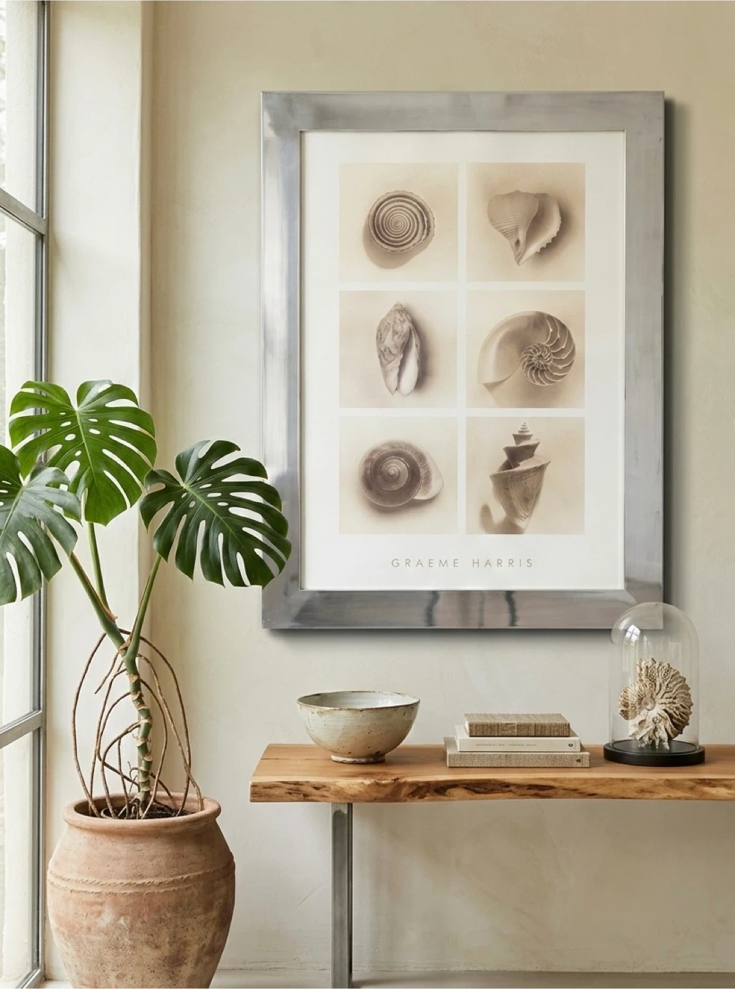 Framed in a gorgeous heavy steel thick frame. The art print featuring a collection of seashell images from the famous Graeme Harris. 32”x24”