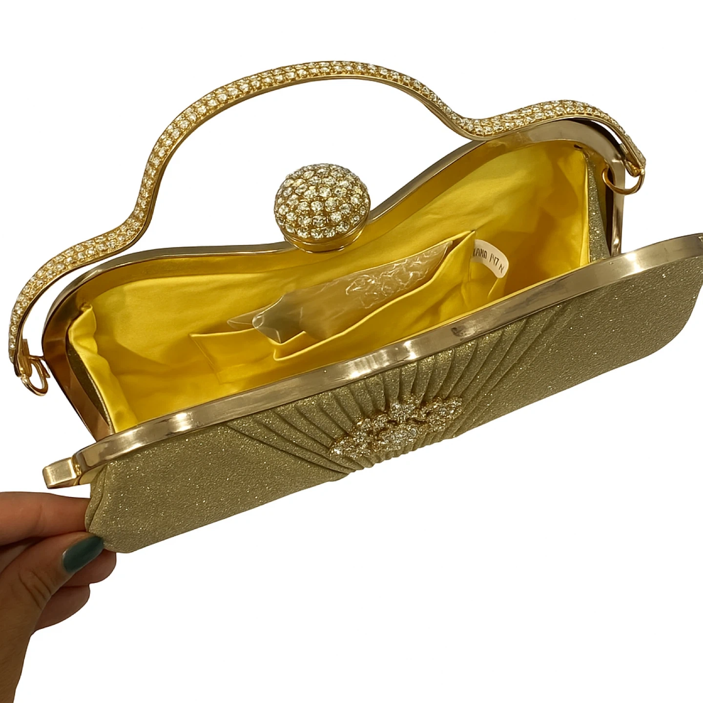 This is a beautiful gold evening bag clutch, perfect for a special occasion! It has a unique design and is in great condition. It features a sparkling exterior and a gold-tone handle. The interior is lined with a satin-like material.