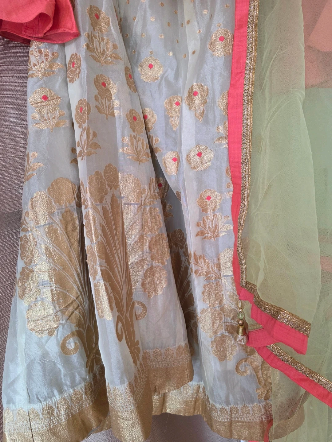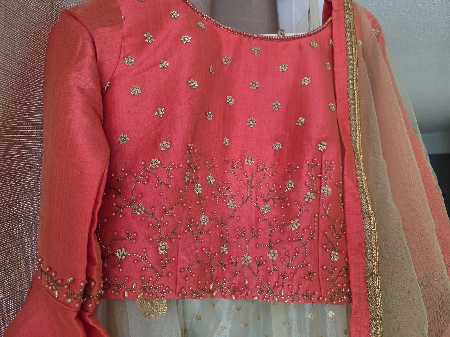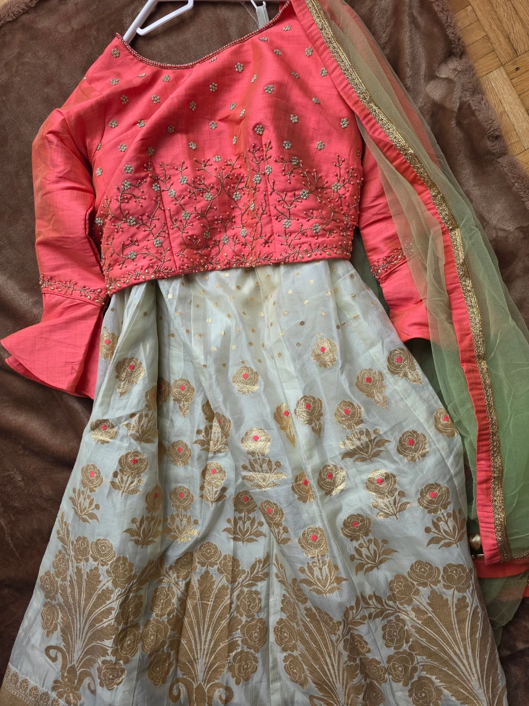 Selling a beautiful Indian lehenga choli set. It features a pink top with delicate embroidery and a flowing skirt with gold floral patterns. The set also includes a light green dupatta with a pink border. Perfect for a special occasion!