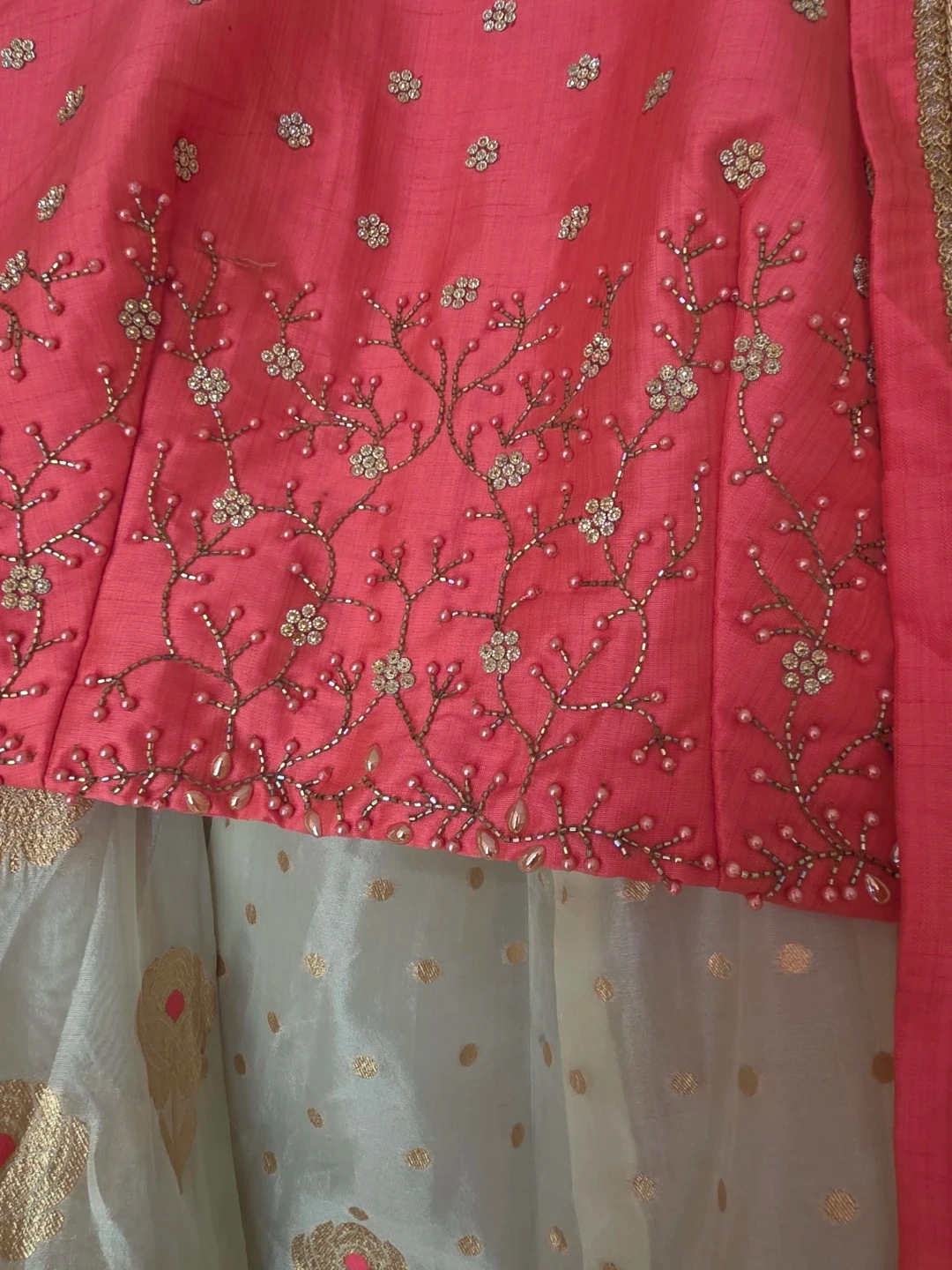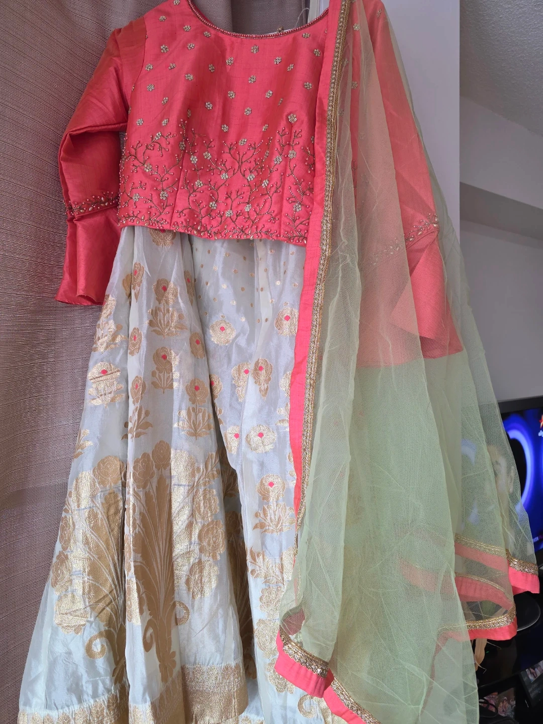 Selling a beautiful Indian lehenga choli set. It features a pink top with delicate embroidery and a flowing skirt with gold floral patterns. The set also includes a light green dupatta with a pink border. Perfect for a special occasion!