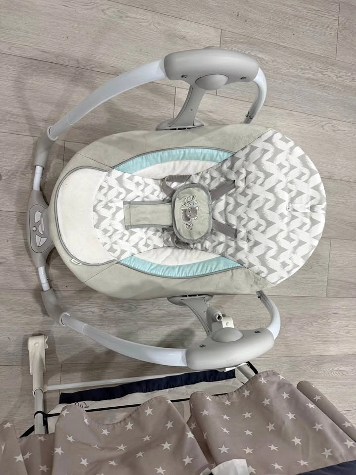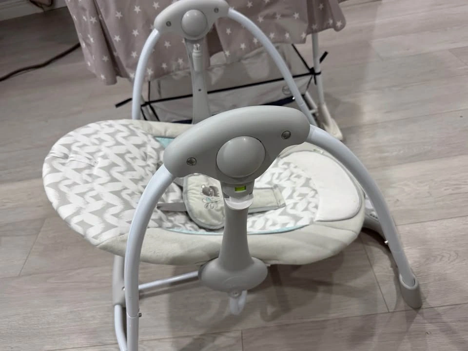 This Ingenuity ConvertMe Swing-2-Seat in grey and white is perfect for your little one! It's in great condition and ready for a new home. The swing easily converts to a seat, offering versatility as your baby grows. It's lightweight and portable, making it ideal for use in different rooms or when travelling. A cozy and convenient option for soothing and entertaining your baby!