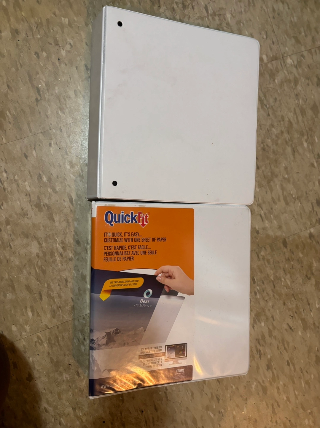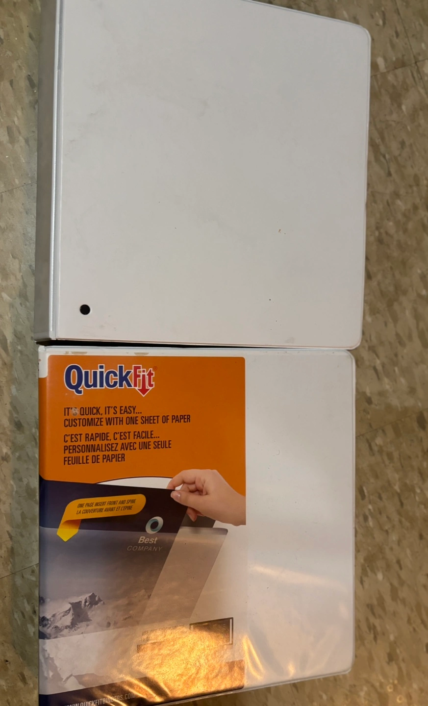 Two white 3-ring binders. One binder has a QuickFit sticker. Both have black rings. They’re brand new never used