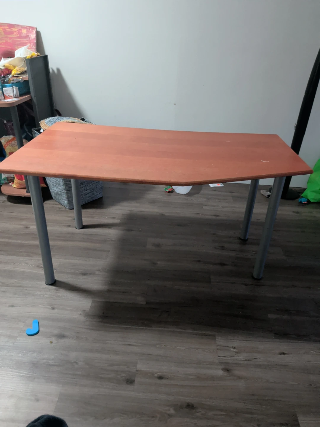 Selling a sturdy wooden desk with a unique angled corner. It's perfect for a home office or study space. The desk has a warm orange tone and silver legs. It's in good condition and ready for a new home!