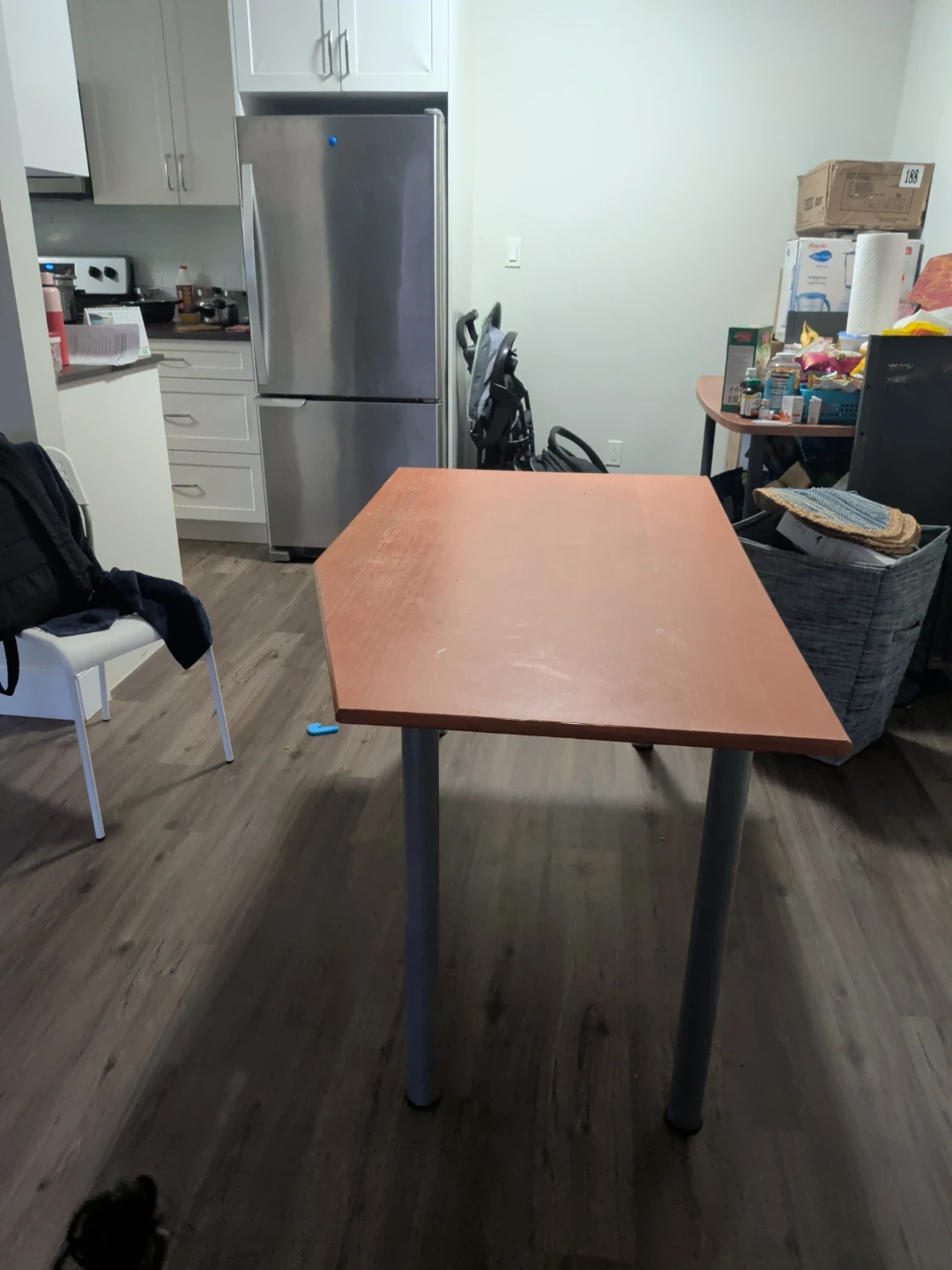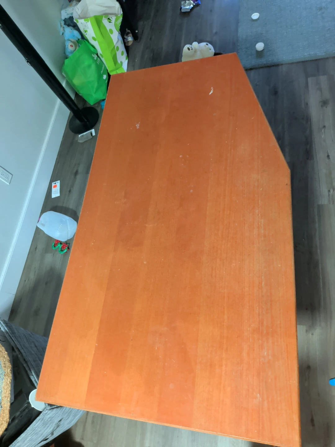 Selling a sturdy wooden desk with a unique angled corner. It's perfect for a home office or study space. The desk has a warm orange tone and silver legs. It's in good condition and ready for a new home!