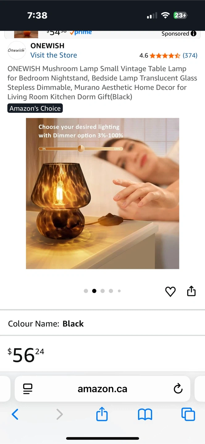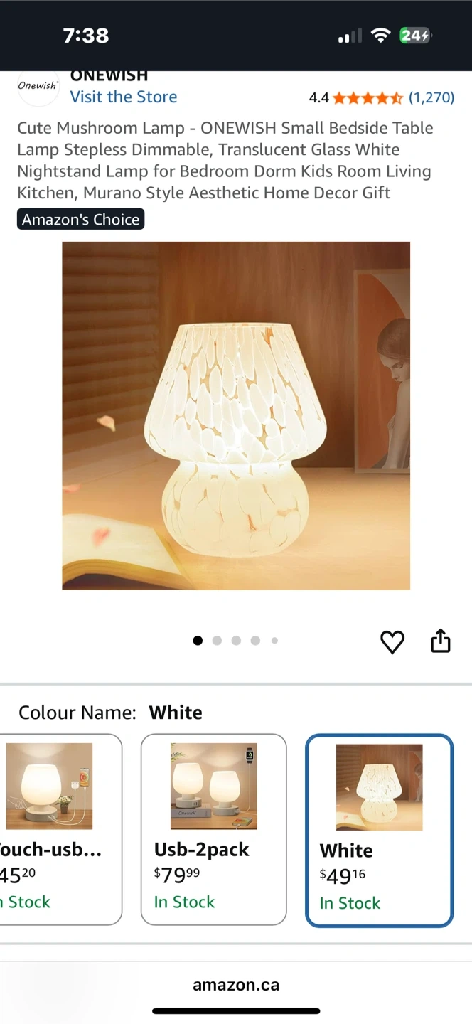 This is a cute mushroom-shaped table lamp from ONEWISH. It features a stepless dimmable translucent glass design. Perfect for a bedside table or dorm room decor!