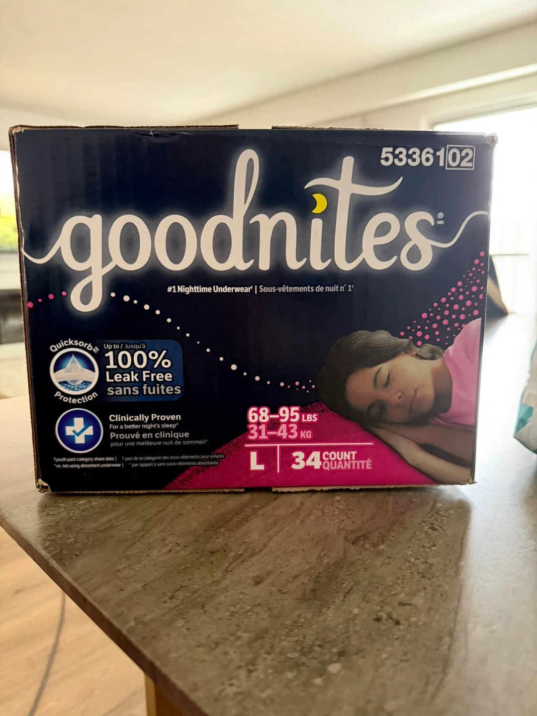 Selling a box of Goodnites nighttime underwear. They are size L, suitable for kids weighing 68-95 lbs (31-43 kg). The box contains 34 units. New & unopened.