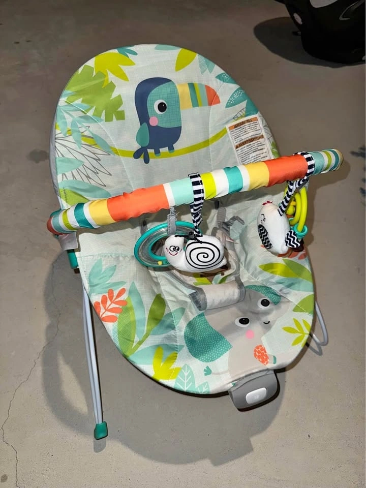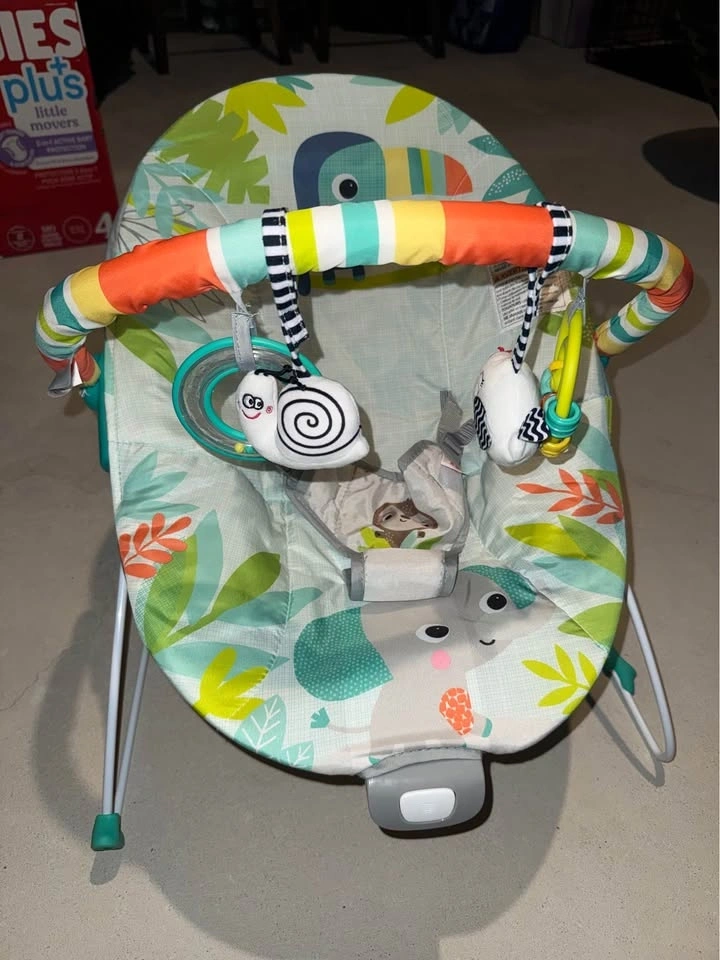 Selling a Bright Starts Rainforest Vibes baby bouncer in great condition. This was barely used and comes from a clean, smoke-free home. Features: Soothing Vibrations: Includes a battery-operated vibration setting to help calm and soothe baby. Removable Toy Bar: Easy to take off with one hand for quick access to baby; includes two colorful hanging toys (snail and bird). Comfortable Design: Features a deep, supportive seat with a 3-point safety harness. Easy to Clean: The seat pad is machine washable. Original Box Included: Great for transport or gifting. Condition: Like New / Excellent. No stains, tears, or wear on the fabric.