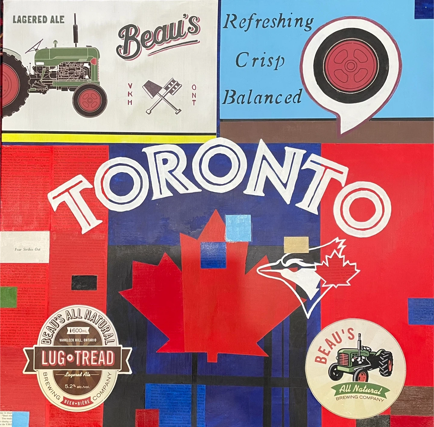 This is a mixed media art piece that features Beau's Brewery and Toronto Blue Jays themes! It includes images of Beau's All Natural Brewing Company, Lug Tread Lagered Ale, and the Toronto Blue Jays. Title is “Perseverance!”