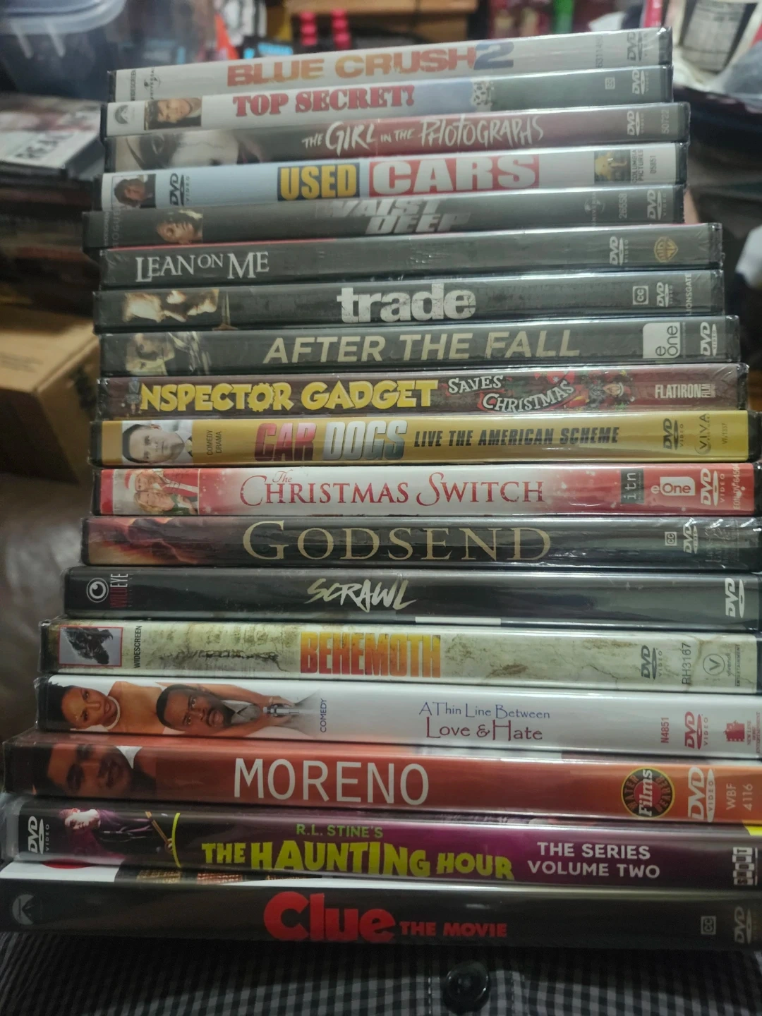 This lot includes 18 DVDs featuring a variety of movies. Titles include Blue Crush 2, Top Secret, The Girl in the Photographs, Used Cars, Deep, Lean on Me, Trade, After the Fall, Inspector Gadget Saves Christmas, Car Dogs, The Christmas Switch, Godsend, Scrawl, Behemoth, A Thin Line Between Love & Hate, Moreno, R.L. Stine's The Haunting Hour Volume Two, and Clue The Movie. All discs appear to be in good condition.