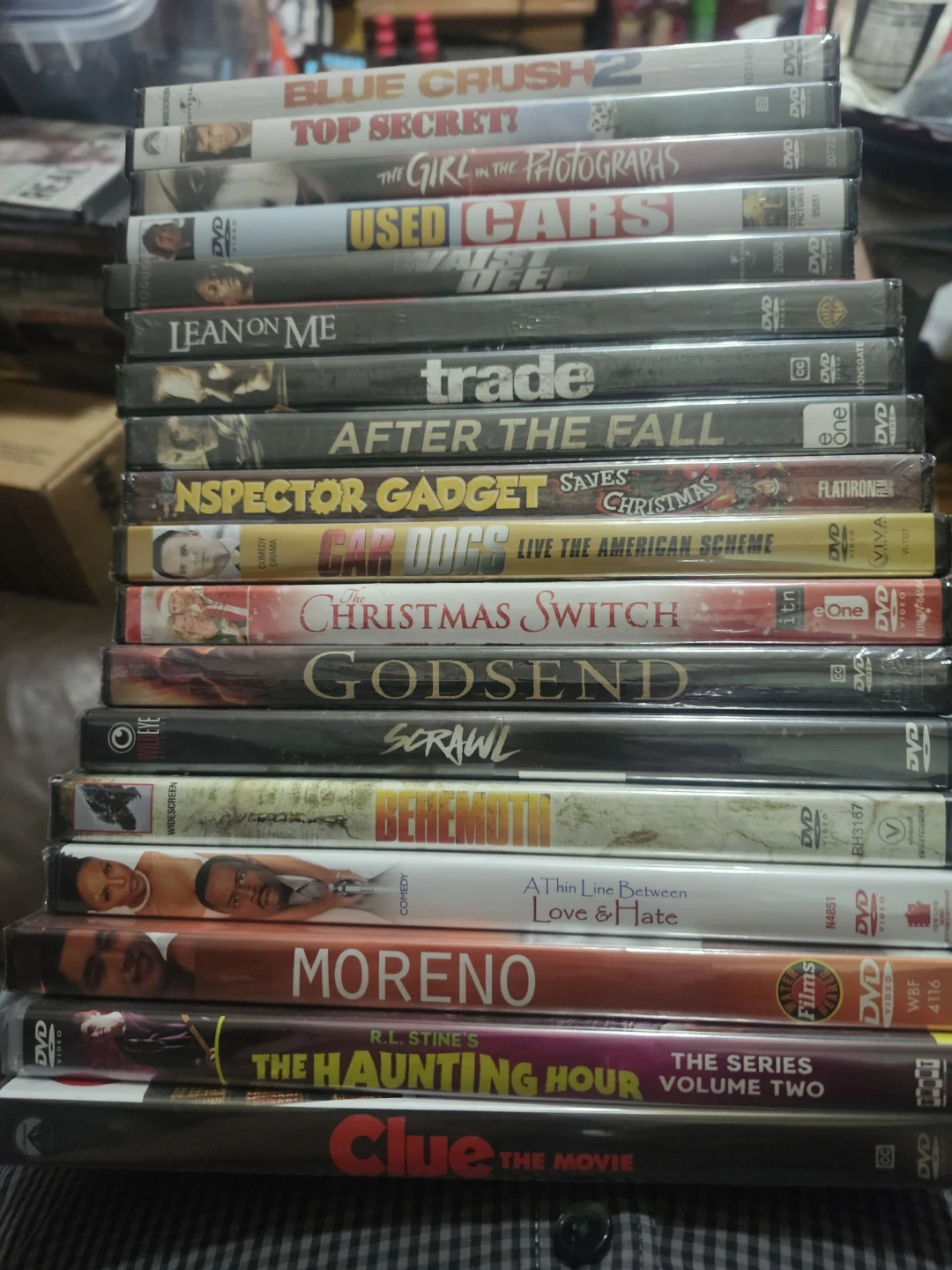 This lot includes 18 DVDs featuring a variety of movies. Titles include Blue Crush 2, Top Secret, The Girl in the Photographs, Used Cars, Deep, Lean on Me, Trade, After the Fall, Inspector Gadget Saves Christmas, Car Dogs, The Christmas Switch, Godsend, Scrawl, Behemoth, A Thin Line Between Love & Hate, Moreno, R.L. Stine's The Haunting Hour Volume Two, and Clue The Movie. All discs appear to be in good condition.