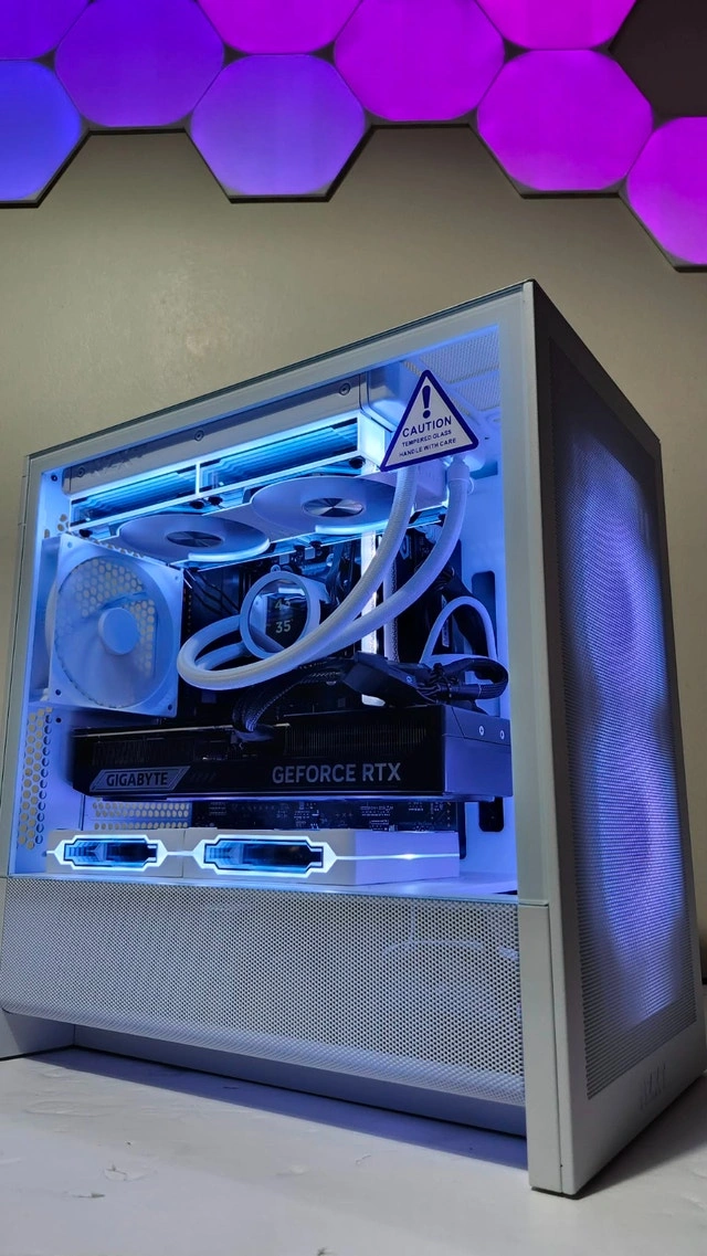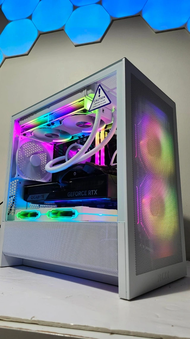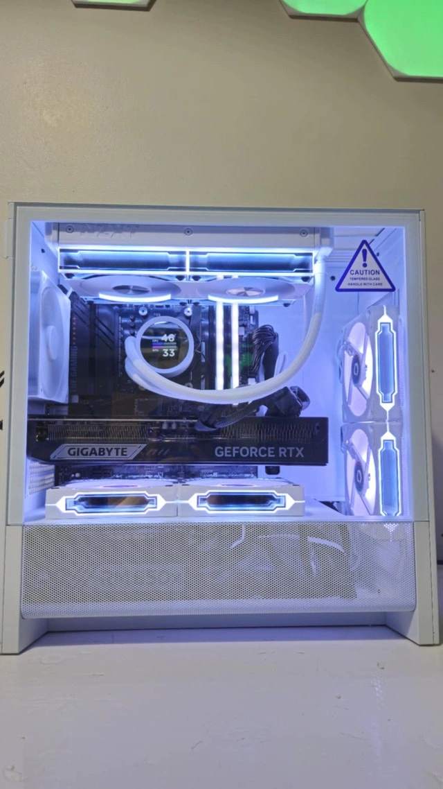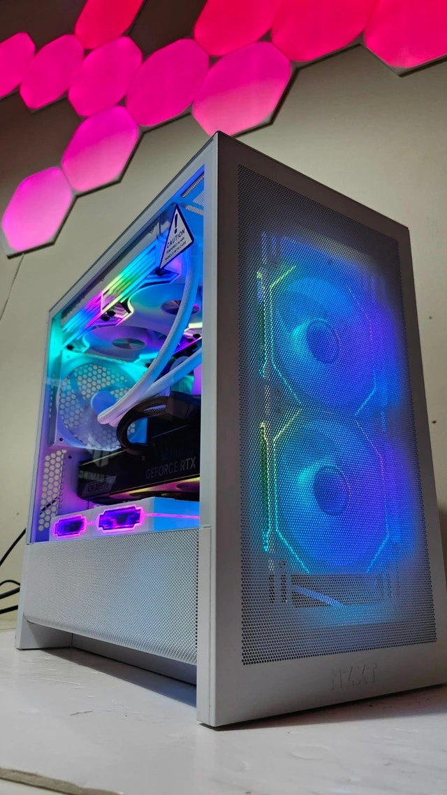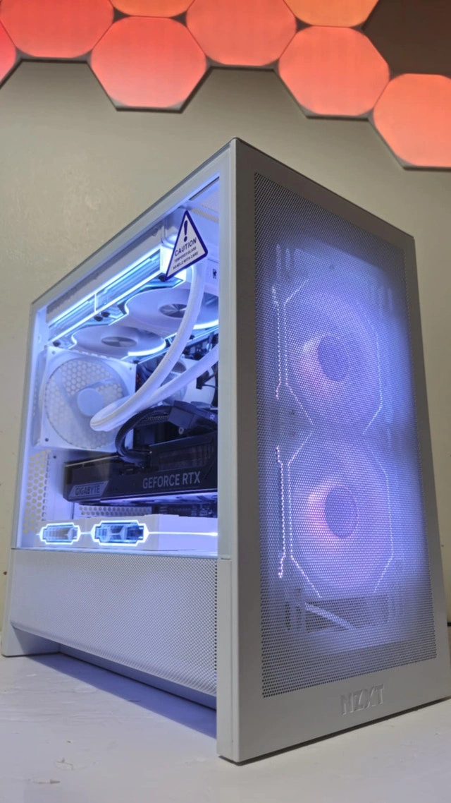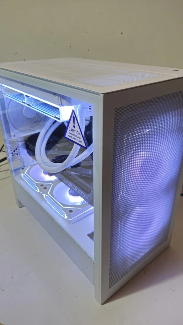 Powerful custom gaming PC with a clean white design! This machine is ready to handle games like Arc Raider, CSGO, GTA 5, and any AAA title at 2K high settings. It's plug and play with Windows 11 and all drivers pre-installed. Features Wi-Fi 6, Bluetooth, and smart RGB lighting control. Raytracing and VR ready. You can test the PC before purchasing. Specs: Ryzen 7 7700 CPU, NZXT Kraken 240 RGB cooler, ASUS TUF A620M WIFI 6 motherboard, 32GB DDR5 5200Mhz RAM, 1TB m.2 Gen 4 NVMe SSD, Gigabyte RTX 5070 Ti 16GB GPU, Corsair RMX 850W Gold PSU, NZXT H3 FLOW case.