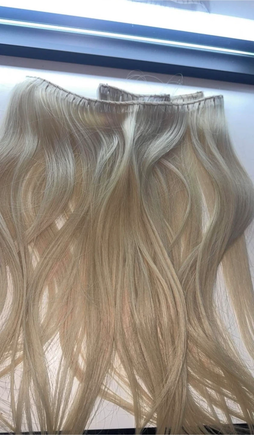 These weft extensions, perfect for adding volume and length. The hair is a lovely blonde shade with subtle highlights. Only worn for 4 weeks, retail price is over $1000