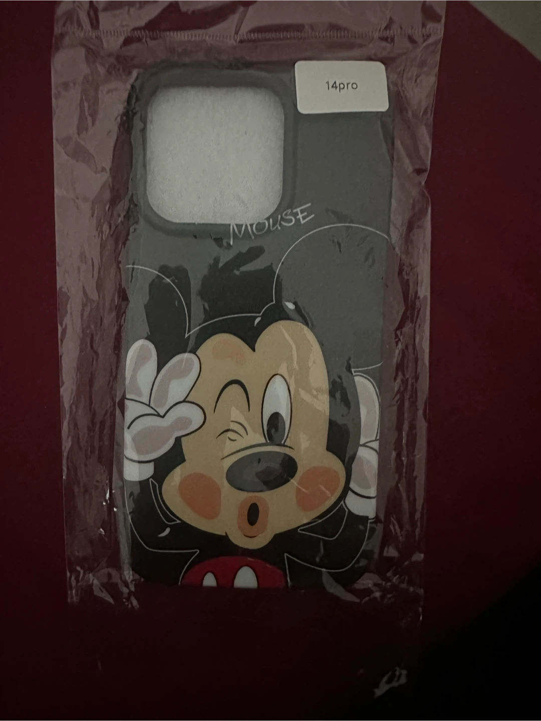 Selling a cute Mickey Mouse phone case designed for the iPhone 14 Pro. Features a playful design of Mickey Mouse winking. The case comes in its original packaging. Protects your phone in style!