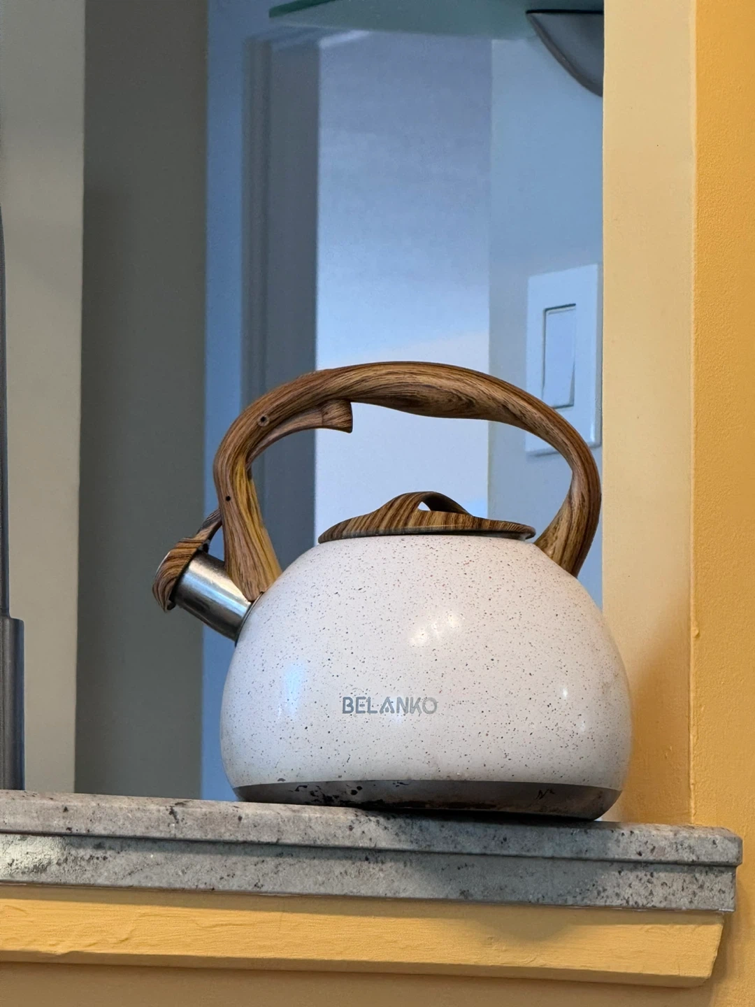 This Belanko kettle has a classic white speckled design. It features a durable stainless steel spout and a stylish wooden handle for comfortable pouring. It's perfect for making your morning tea or coffee.