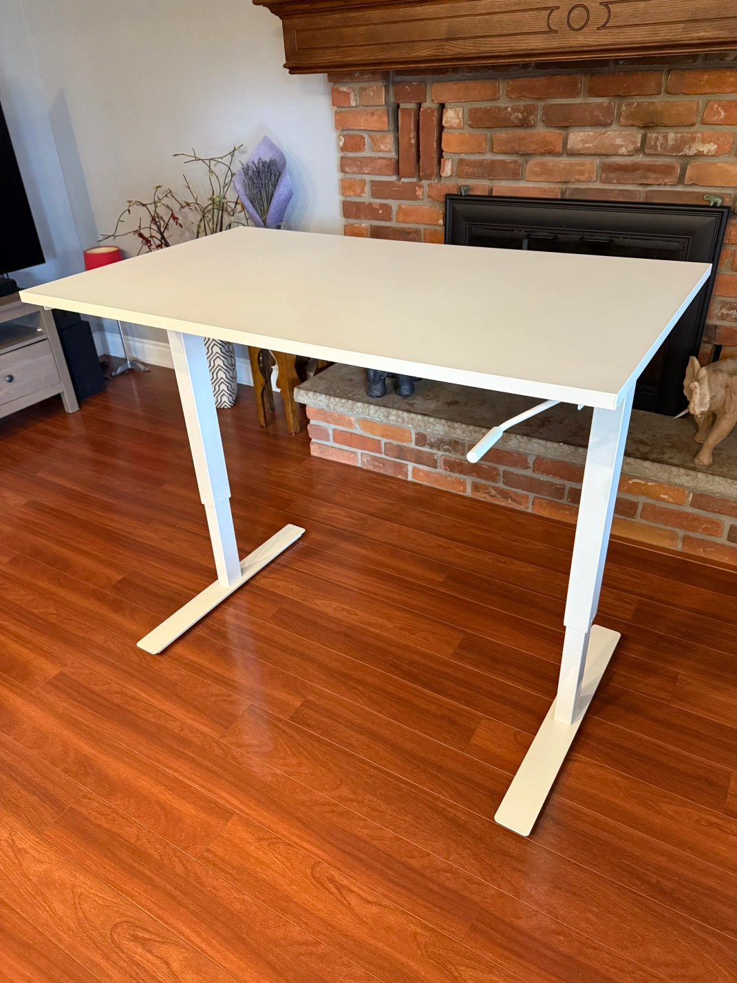 Selling a white adjustable height standing desk. It's in great condition and perfect for a home office setup. It's easy to adjust to your preferred height, making it comfortable for long work sessions