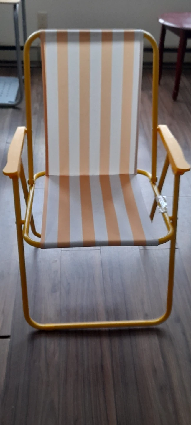 This folding camp chair features a yellow metal frame with orange and white stripes. It's lightweight and easy to carry. Perfect for camping trips or backyard lounging!