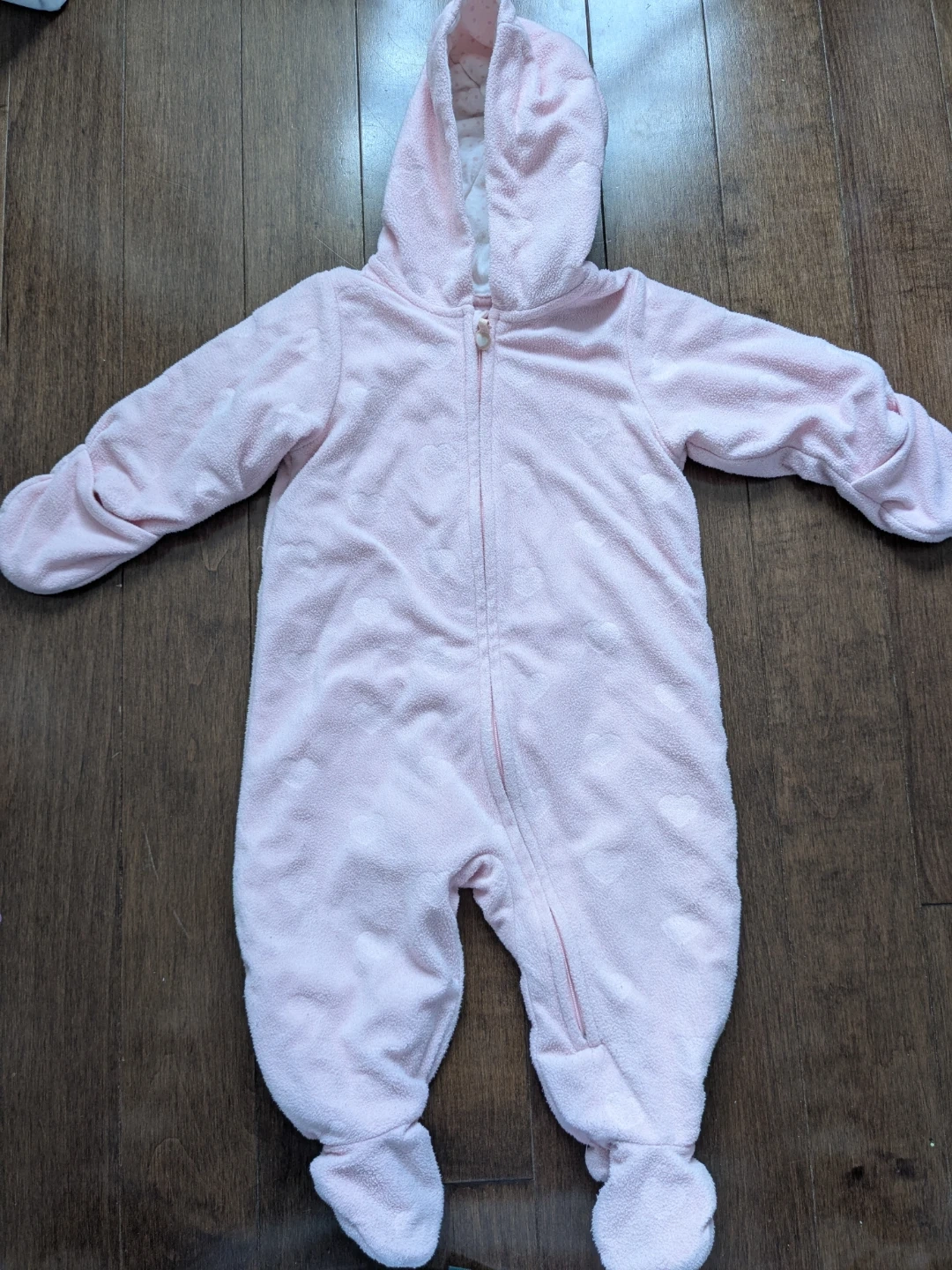 Soft pink fleece sleepsuit with a hood and all-over heart pattern for spring or fall season. It features a full front zipper for easy dressing. This is a cozy one-piece for a baby.
