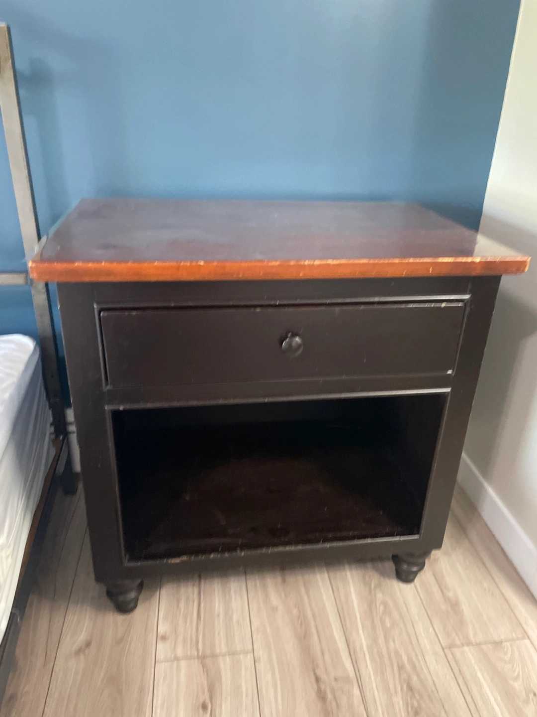 Here's a cute nightstand with a drawer and an open shelf underneath. It's a dark brown colour with a lighter brown top. It would be perfect for a bedroom or guest room!
