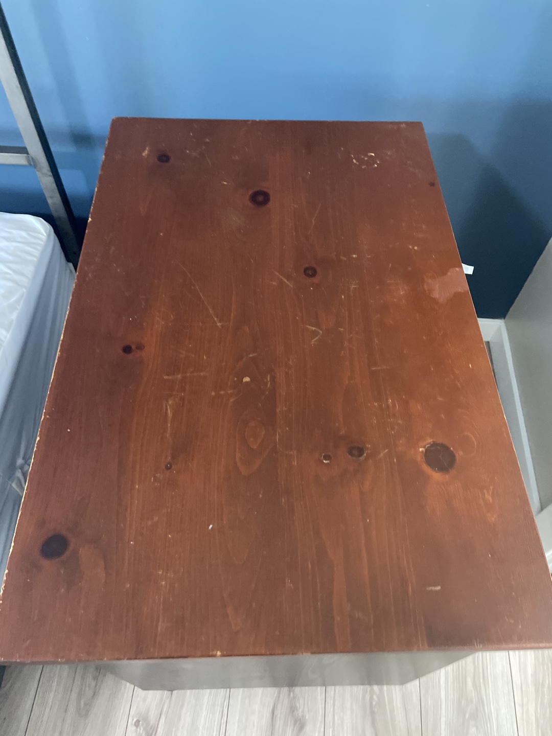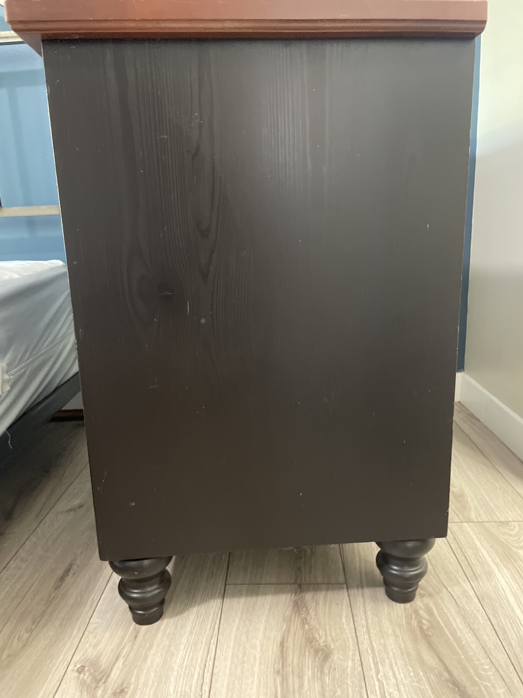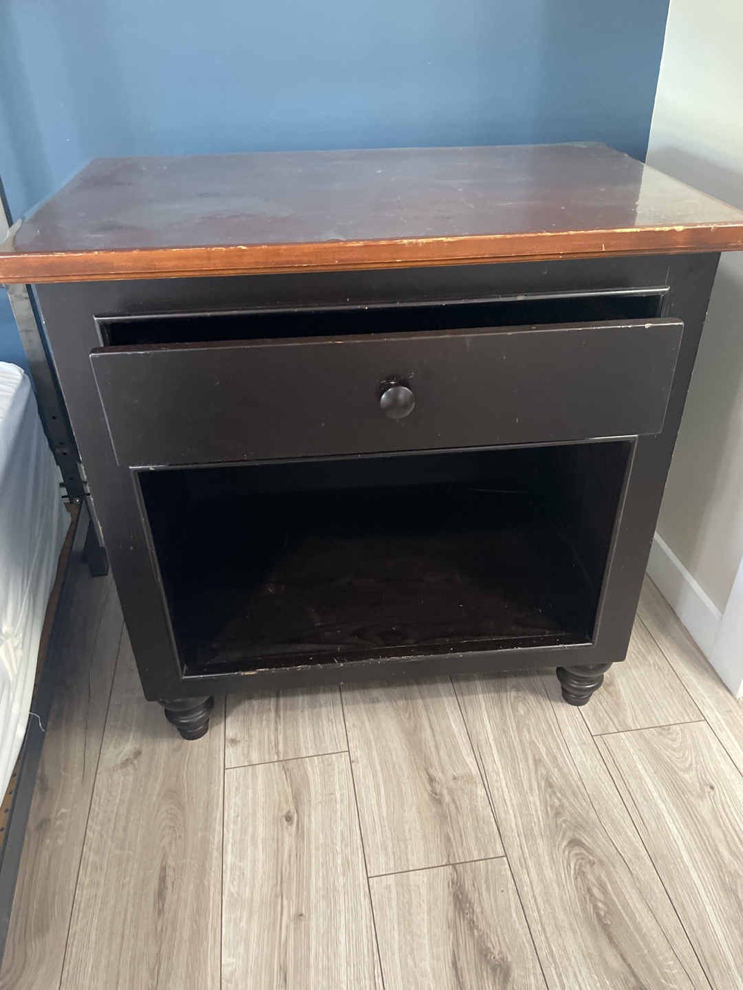 Here's a cute nightstand with a drawer and an open shelf underneath. It's a dark brown colour with a lighter brown top. It would be perfect for a bedroom or guest room!