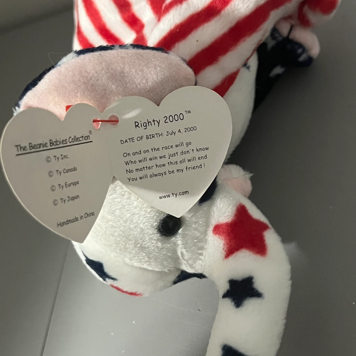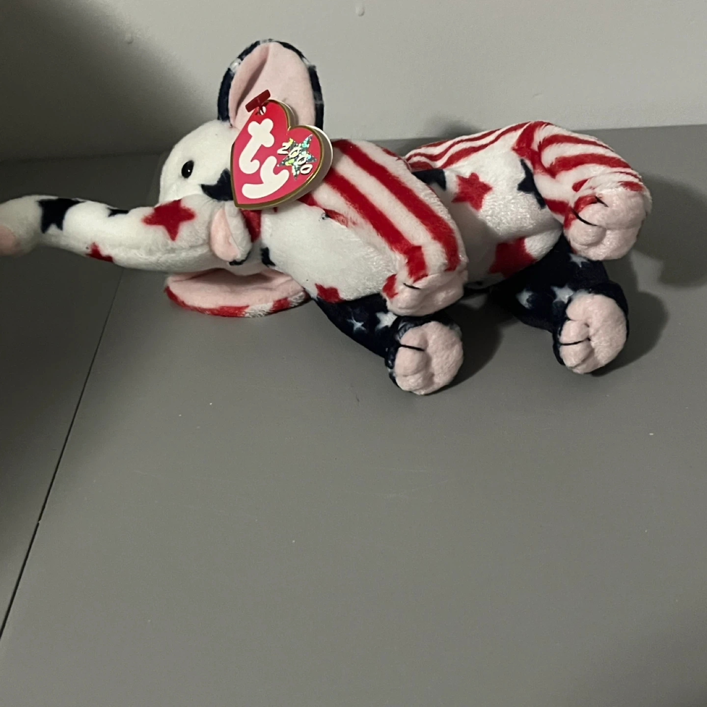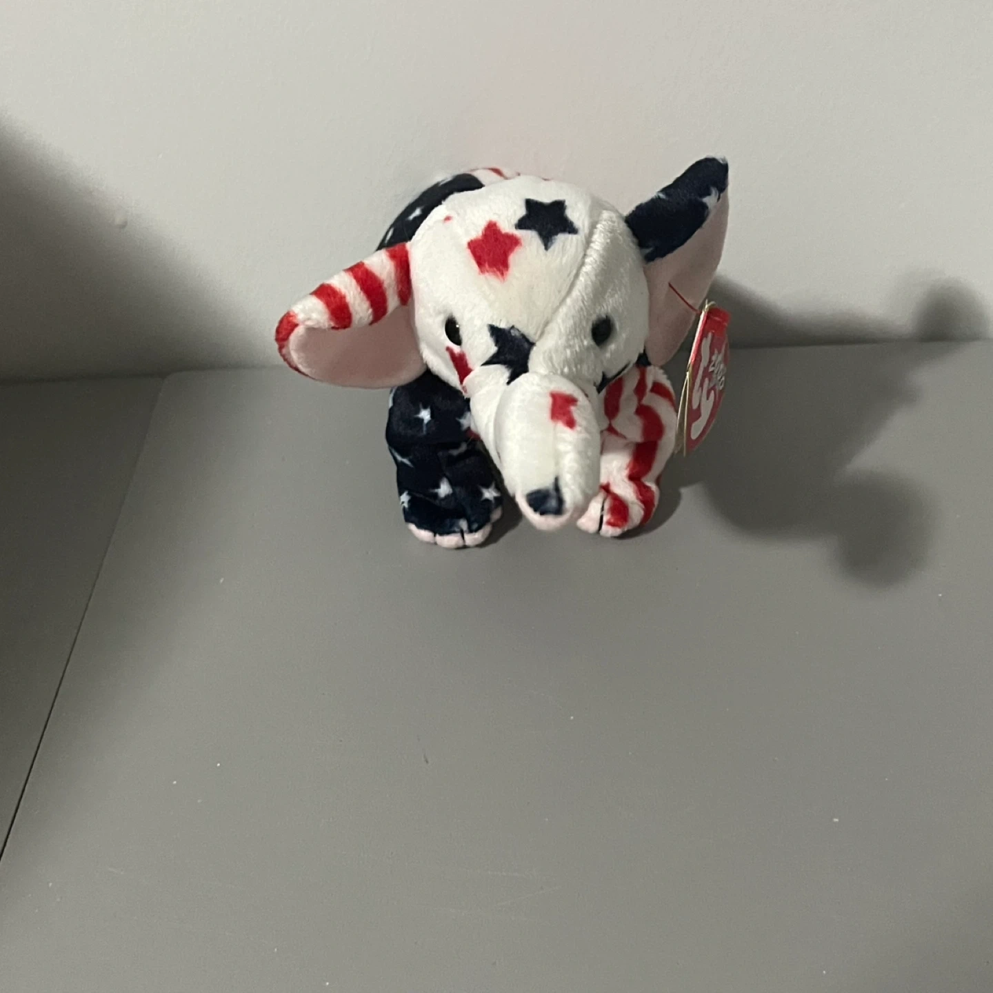 Here's a Ty Beanie Baby named Righty the Elephant! It features a unique design with stars and stripes. It's in great condition and would make a lovely addition to any collection!