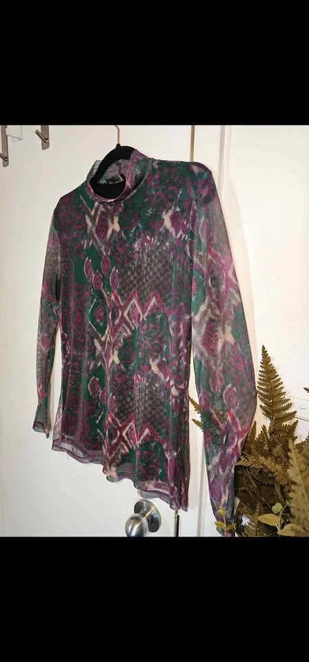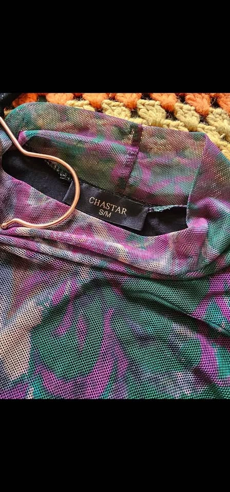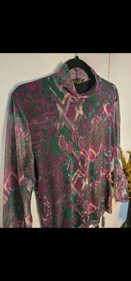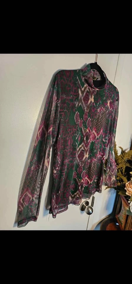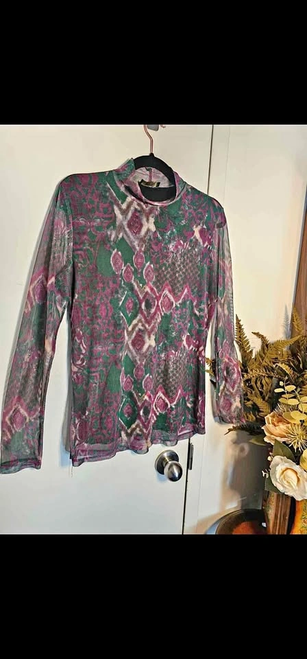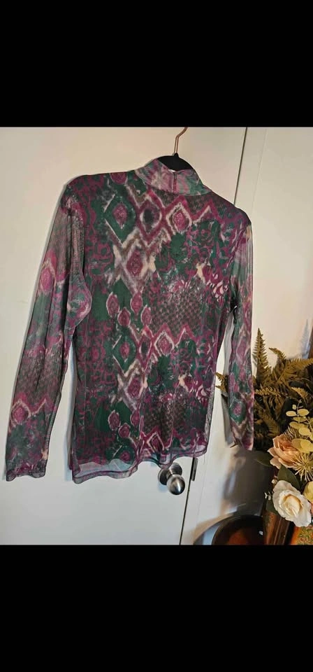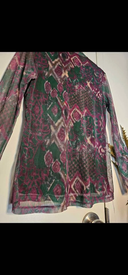 Cute Y2K grunge mesh mock neck long sleeve top in dark green, purple/ mauve, and off-white. Top is fully lined in the torso (front and back) and sheer at the sleeves and collar. It has abstract psychedelic patterns that alternate between swirls, checkers, and diamonds.