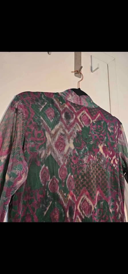 Top is a size Small/ Medium and in excellent used condition. Pit to pit measures about 19.5" unstretched, pit to sleeve hem measures about 20.5", and shoulder to bottom hem measures about 26". Top has quite a bit of stretch.
