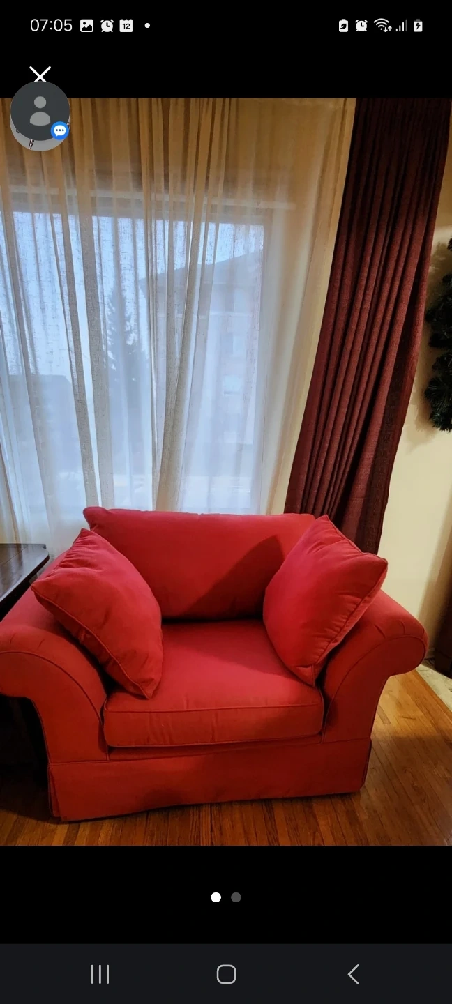 Comfortable red armchair with plush cushions. It's a cozy addition to any living space. Great for reading or relaxing! Must be able to pick up in West End of Downtown in Sunalta SW area