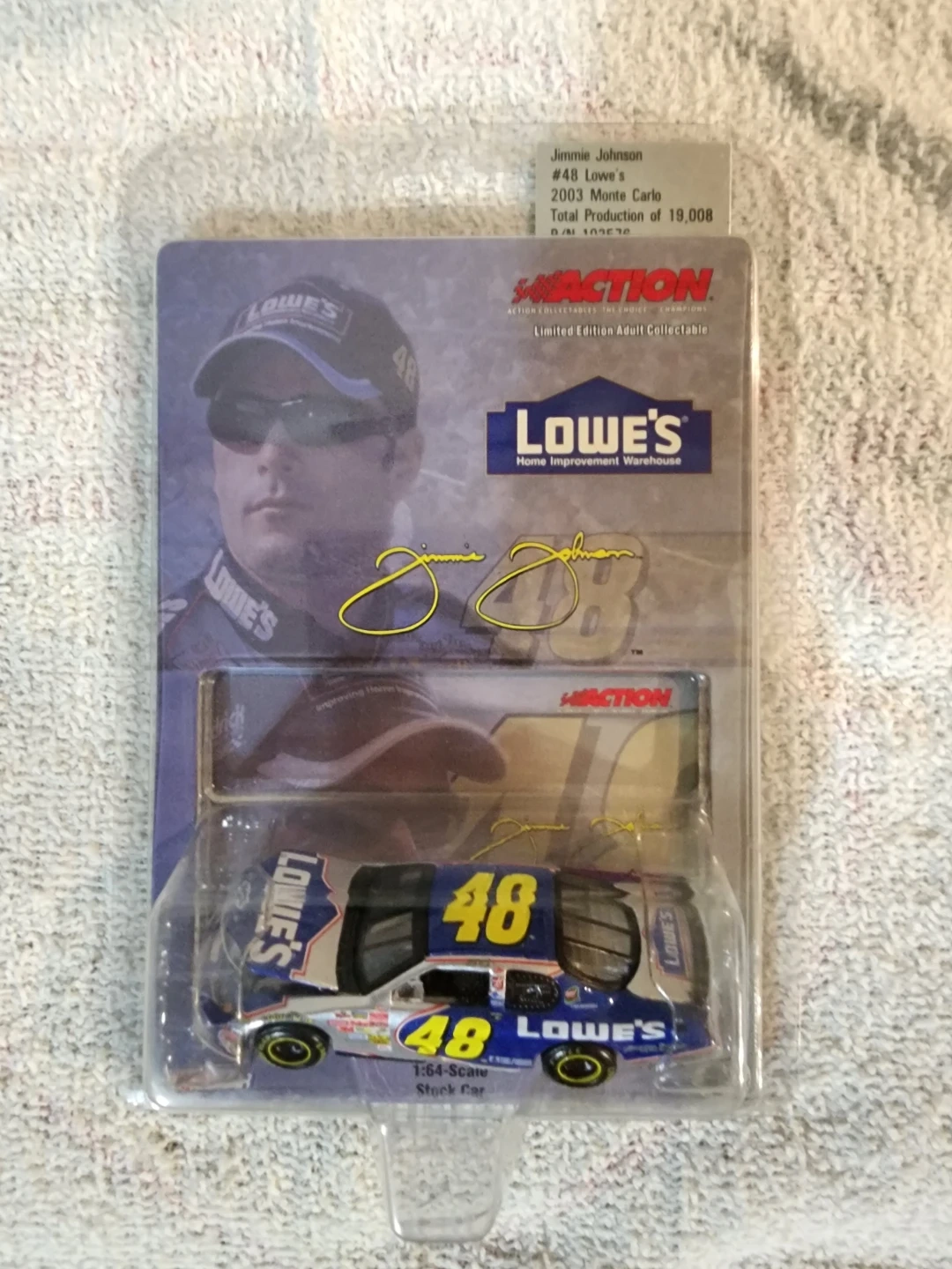 This is a Jimmie Johnson #48 Lowe's 2003 Monte Carlo die-cast stock car. It's a 1:64 scale collectible. Total production was 19,008 units. This item is a limited edition adult collectible.