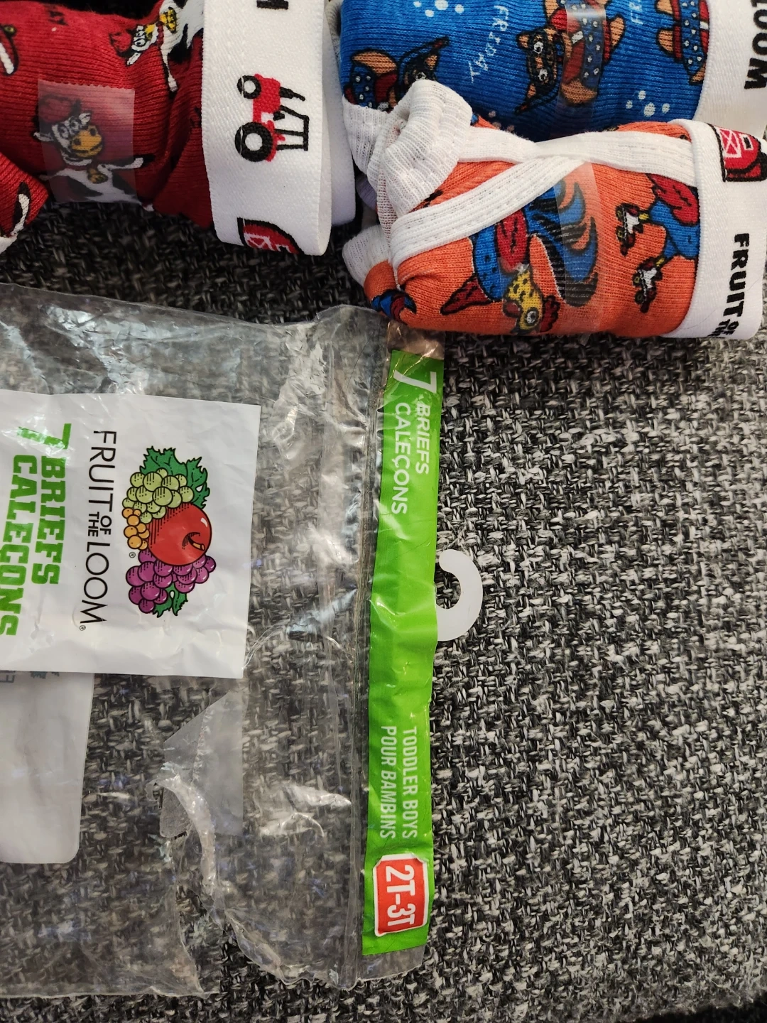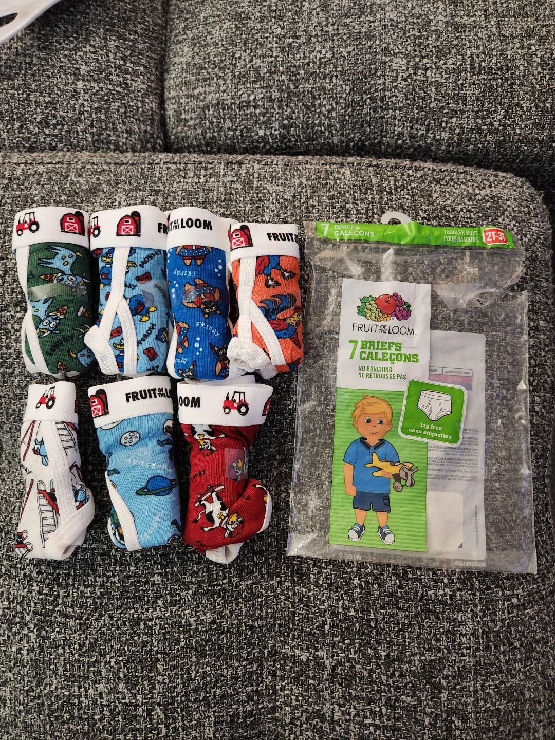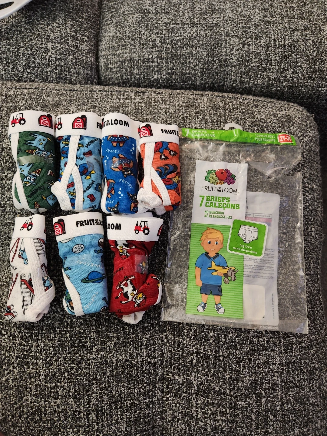 A pack of seven Fruit of the Loom toddler boys' briefs in size 2T/3T. They feature various fun prints and a soft waistband for comfort. Made from 100% cotton. Tag free, no bunching.