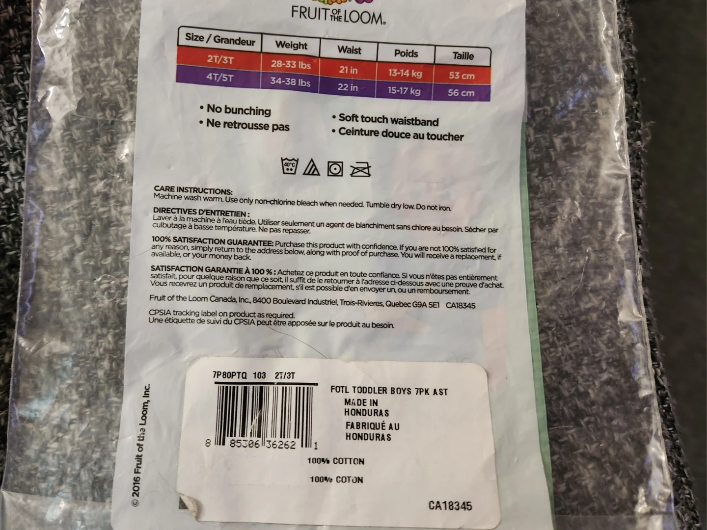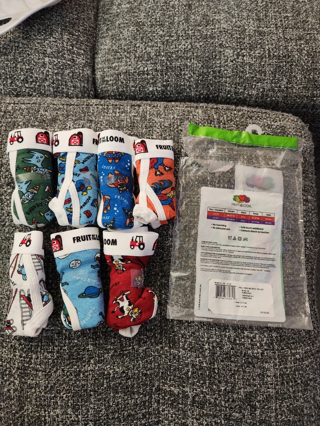 A pack of seven Fruit of the Loom toddler boys' briefs in size 2T/3T. They feature various fun prints and a soft waistband for comfort. Made from 100% cotton. Tag free, no bunching.