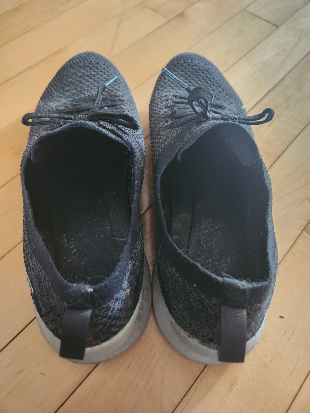 Pair of gently used Skechers knit running shoes. Dark grey colour. Lace-up style. Comfortable and lightweight. Show some wear.
