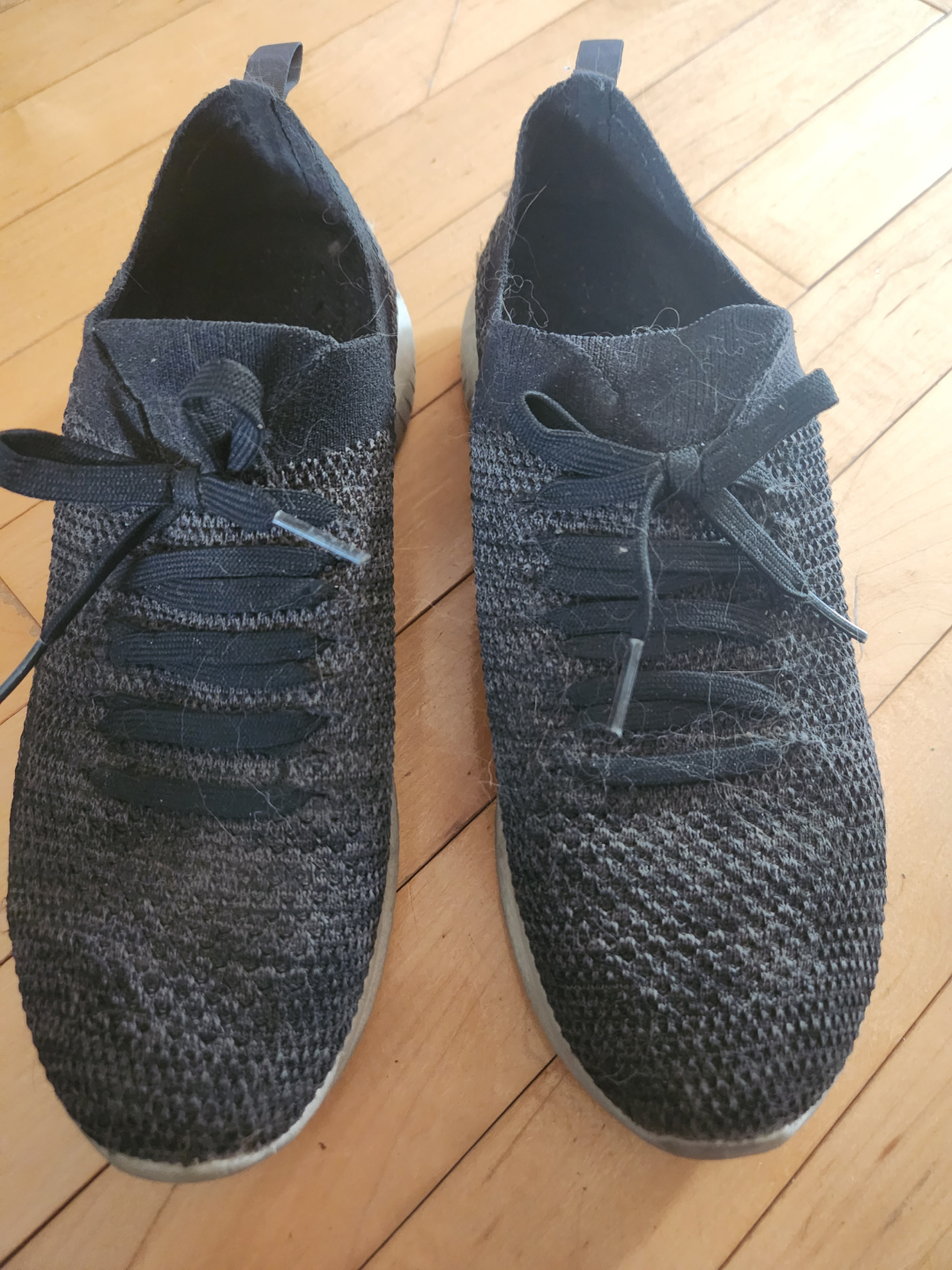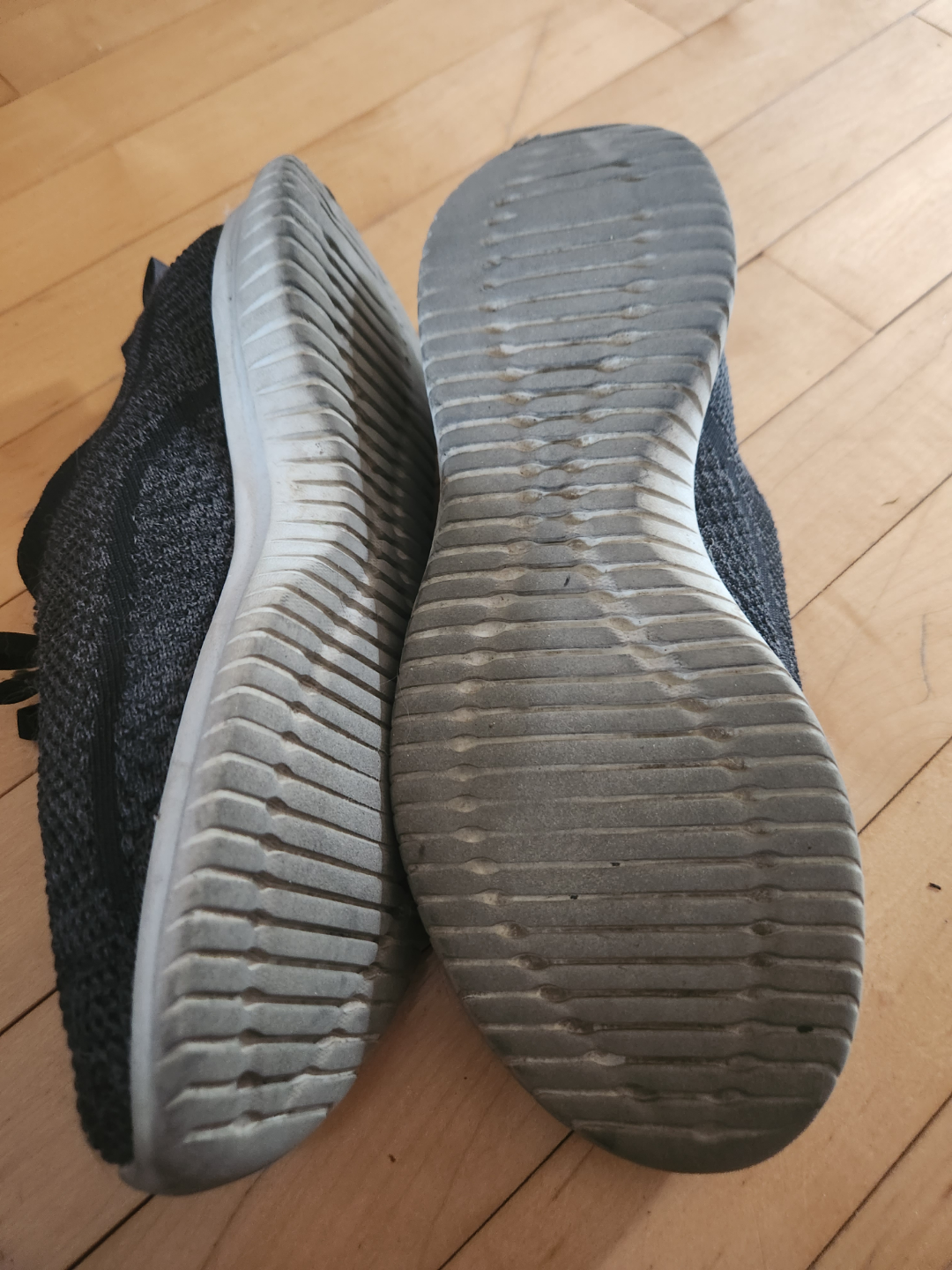 Pair of gently used Skechers knit running shoes. Dark grey colour. Lace-up style. Comfortable and lightweight. Show some wear.