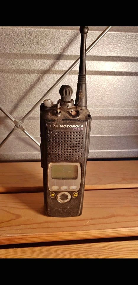 Rugged Motorola XTS 5000 two-way radio with black plastic housing, digital display, and keypad. Device is dusty from storage and shows signs of heavy use. Includes antenna and top control knobs.