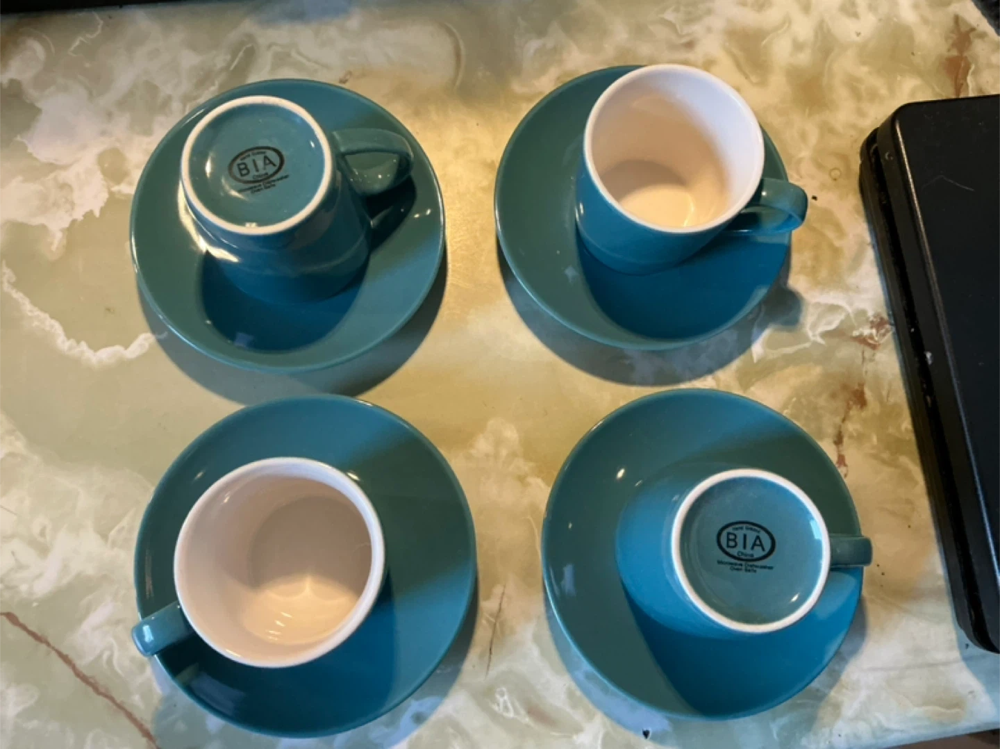 10Selling a set of four BIA Cordon Bleu espresso cups and saucers in a lovely turquoise colour! These are perfect for enjoying your morning coffee or tea. They're in great condition and ready for a new home