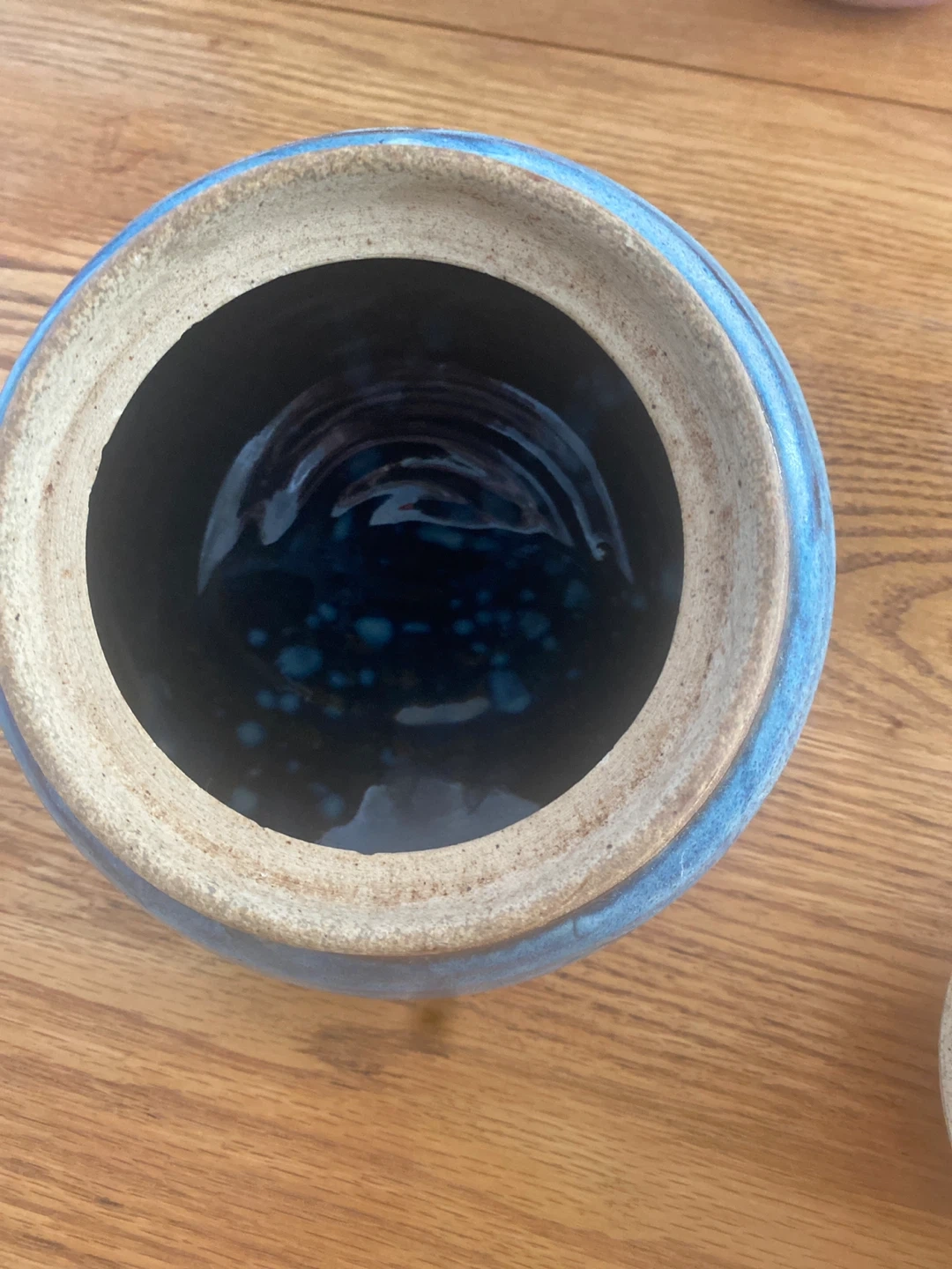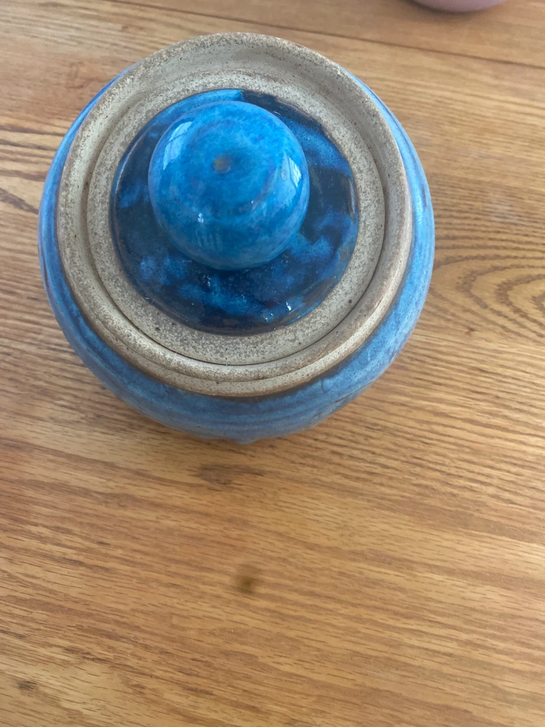 Here's a lovely blue ceramic jar with a lid! It's perfect for storing small items or adding a touch of colour to your kitchen or bathroom. It's in great shape and ready for a new home