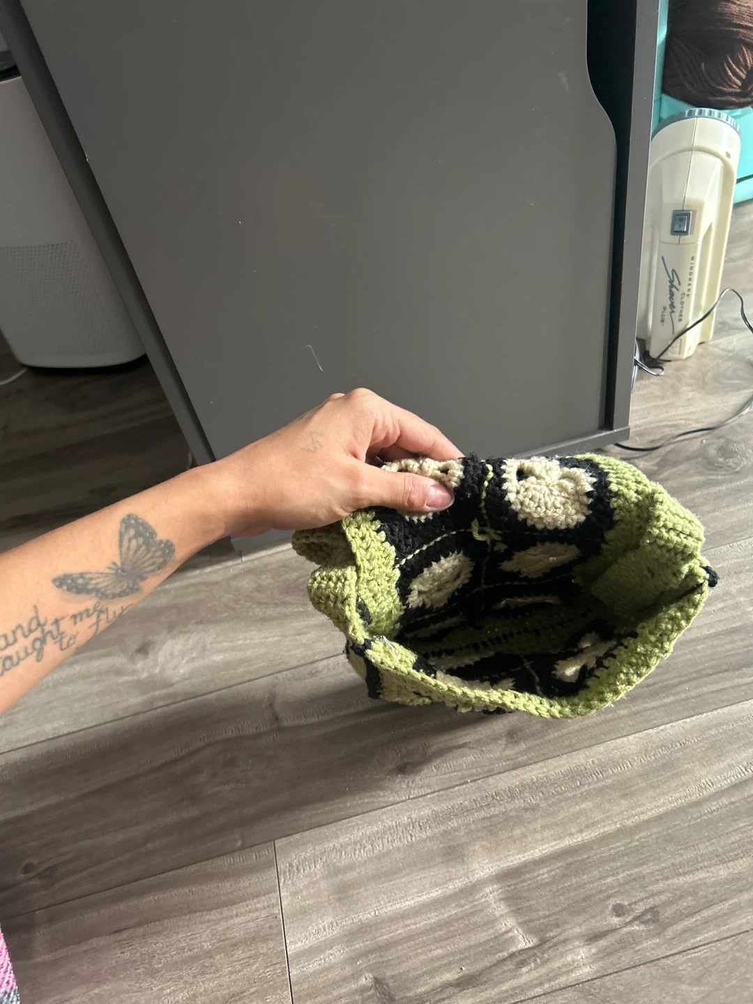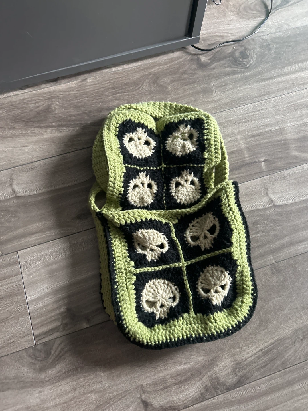 Handmade crocheted shoulder bag featuring a lime green and black colour scheme with skull appliques. It's a unique, eye-catching accessory. The strap is long for comfortable crossbody wear.