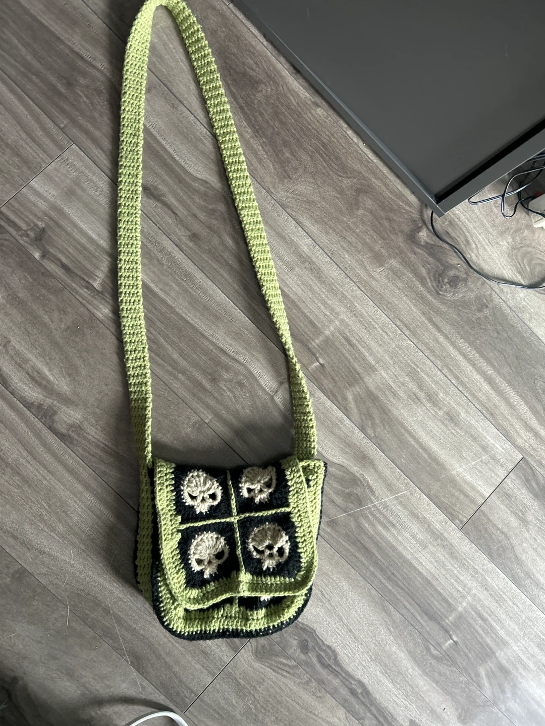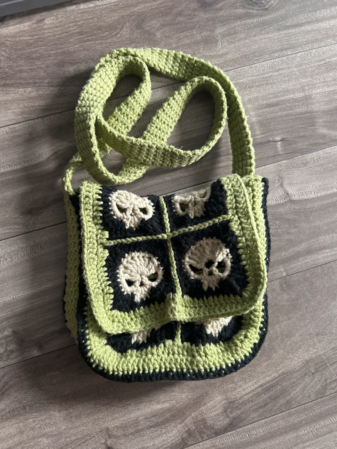 Handmade crocheted shoulder bag featuring a lime green and black colour scheme with skull appliques. It's a unique, eye-catching accessory. The strap is long for comfortable crossbody wear.