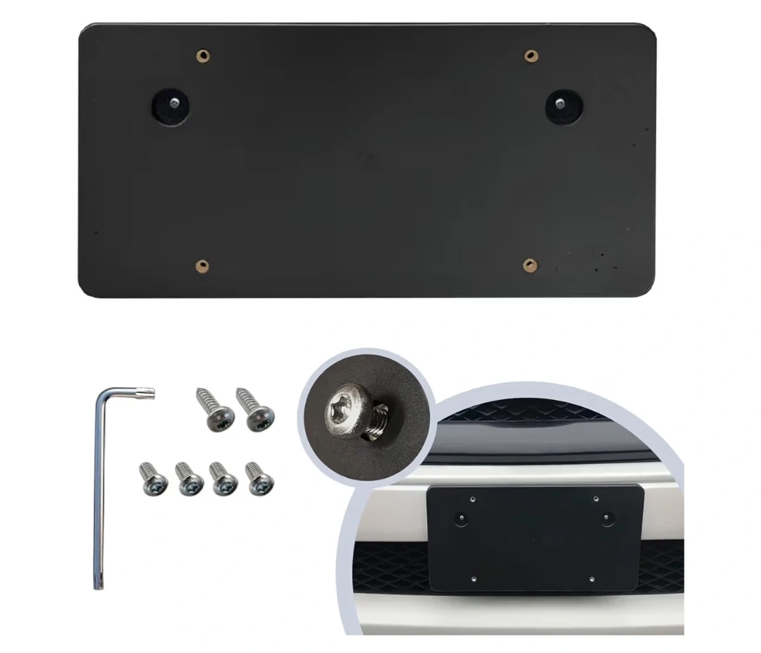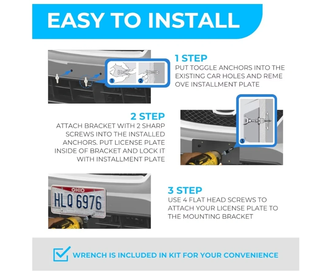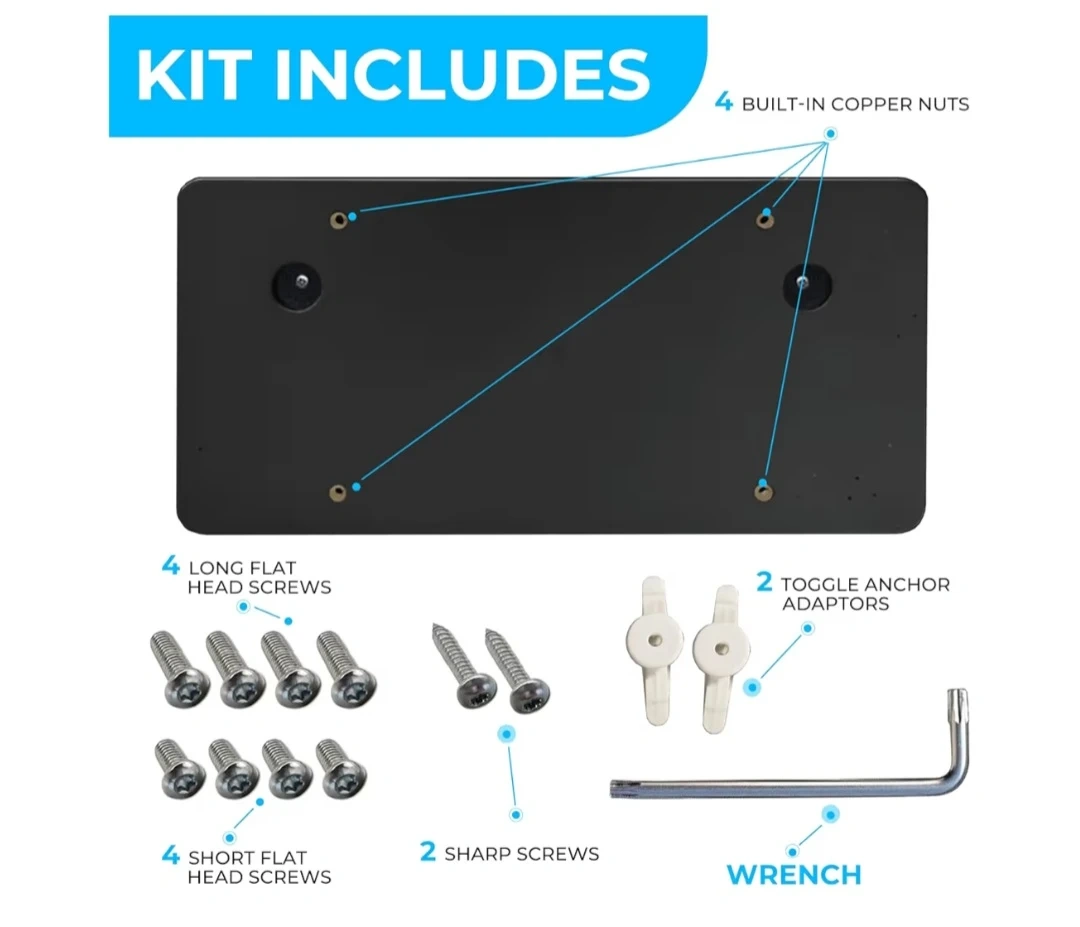 Package Includes : 1 Mounting Bracket , 2 Screws with 2 Adapters to Mount Bracket to your bumper, 4 Short Screws to hold your license plate , 4 Long Screws to hold your license plate with Frame , 1 Wrench. Tools Required : Phillips head Screwdriver