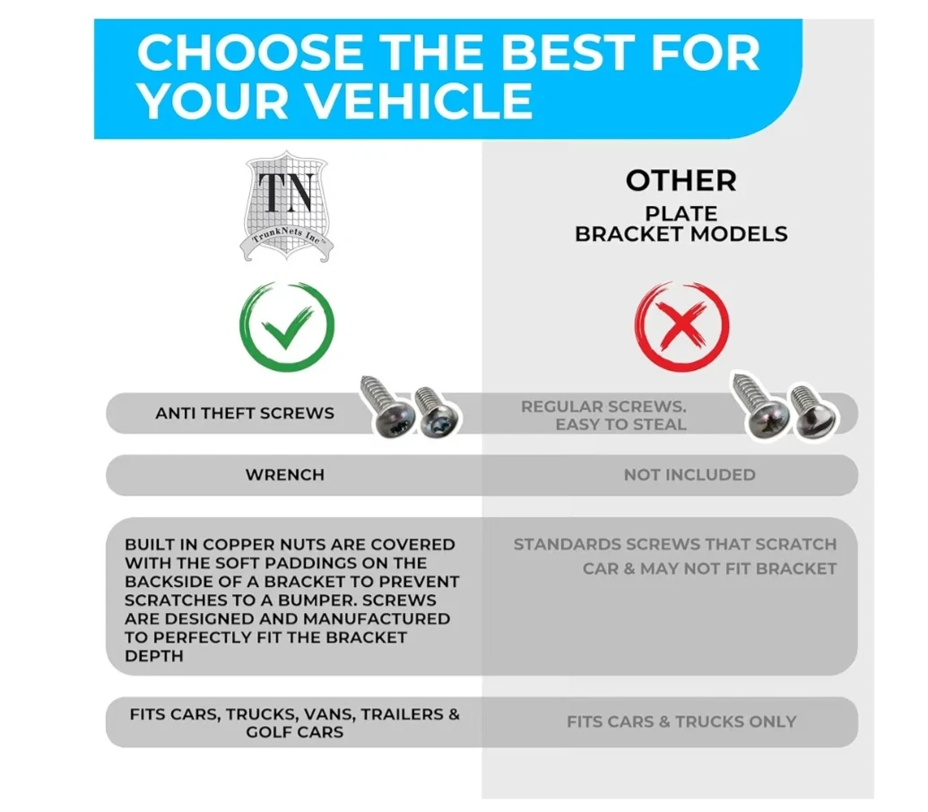 Package Includes : 1 Mounting Bracket , 2 Screws with 2 Adapters to Mount Bracket to your bumper, 4 Short Screws to hold your license plate , 4 Long Screws to hold your license plate with Frame , 1 Wrench. Tools Required : Phillips head Screwdriver