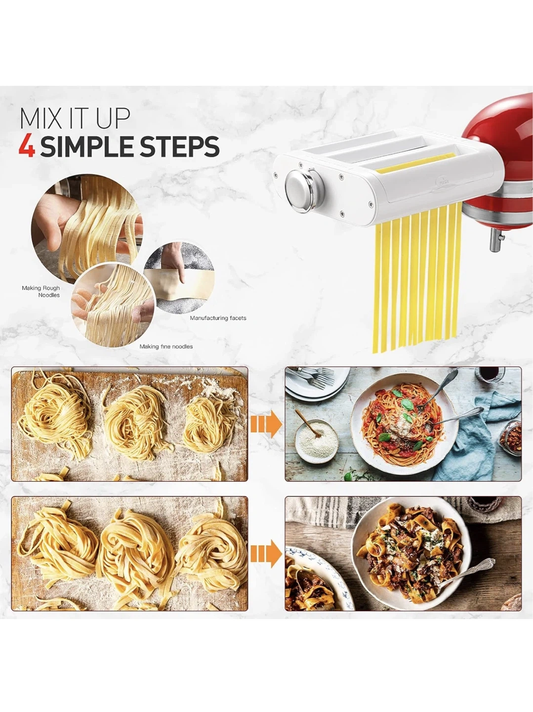 This attachment fits KitchenAid stand mixers to make fresh pasta. It features an 8-gear adjustment for controlling pasta thickness. The sharp 304 stainless steel chuck is designed for delicate pasta.
