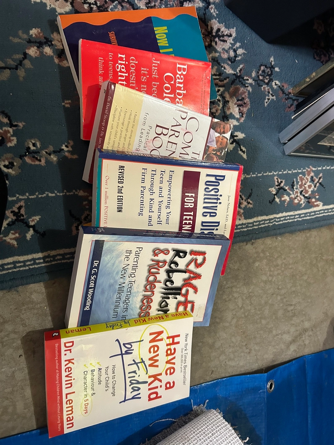 Collection of parenting books. Titles include Positive Discipline for Teens, Have a New Kid by Friday, Rage, Rebellion & Rudeness, and more. Various authors and editions. All together