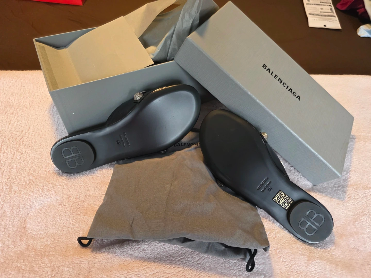 Balenciaga black slide sandals with silver stud detailing. Includes original box and dust bags. Leather material.