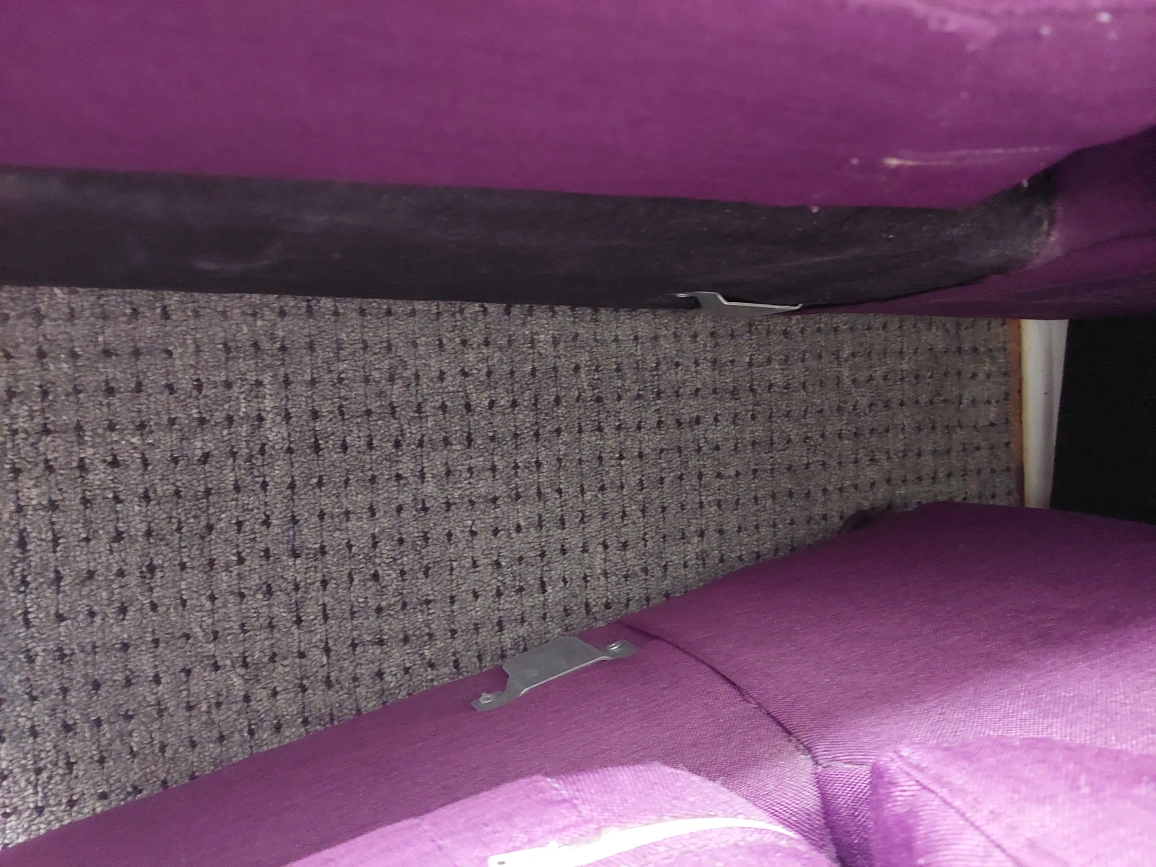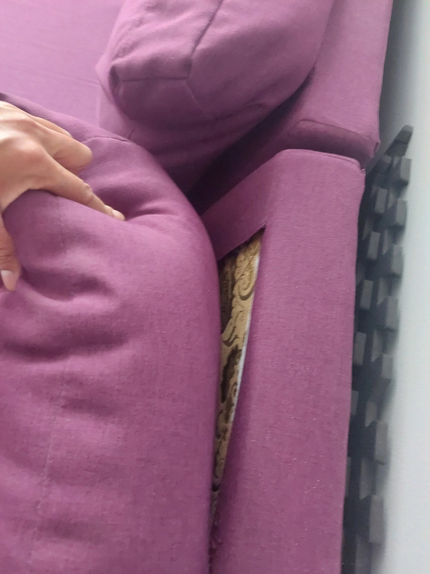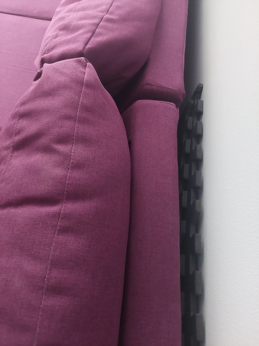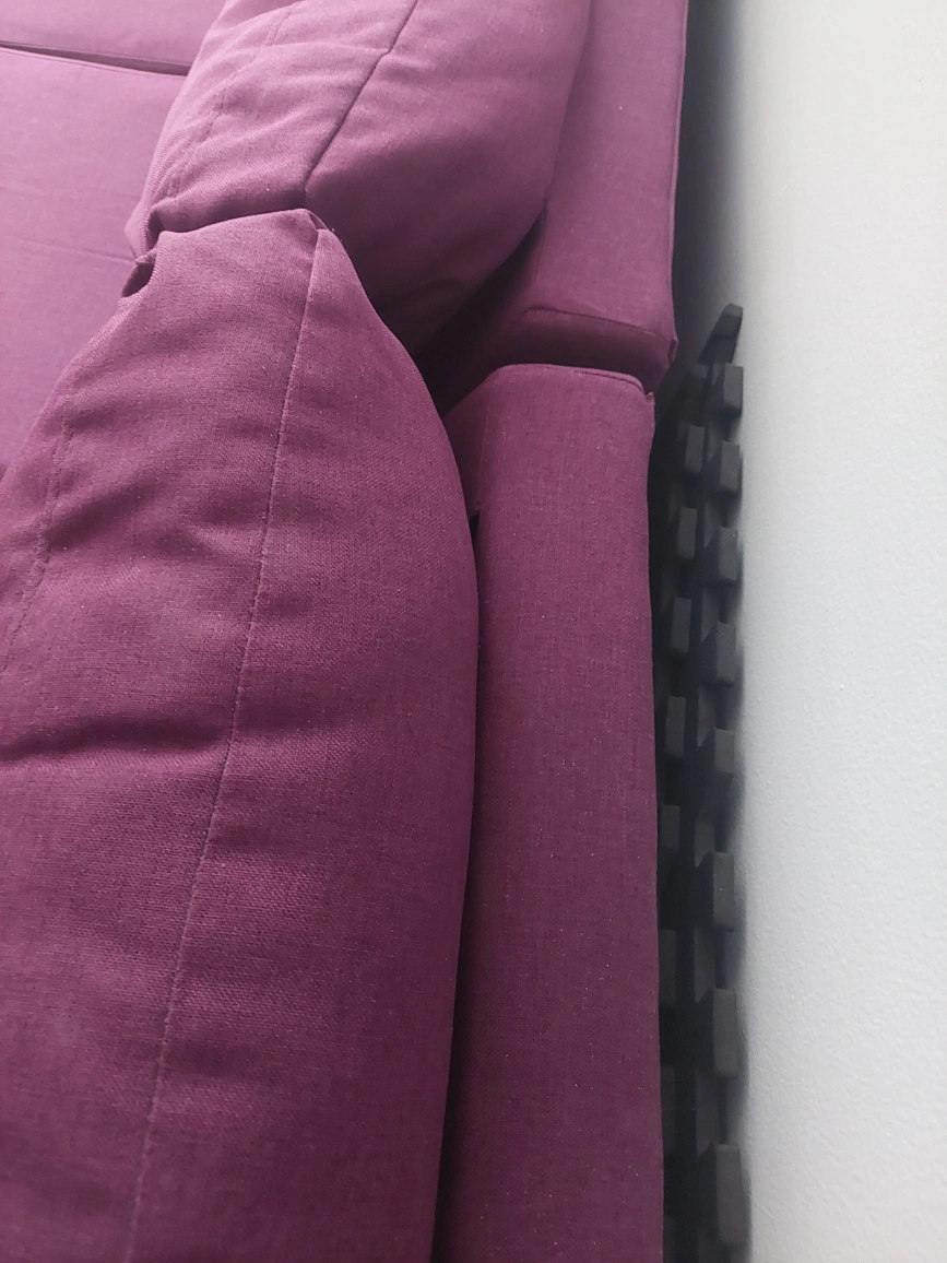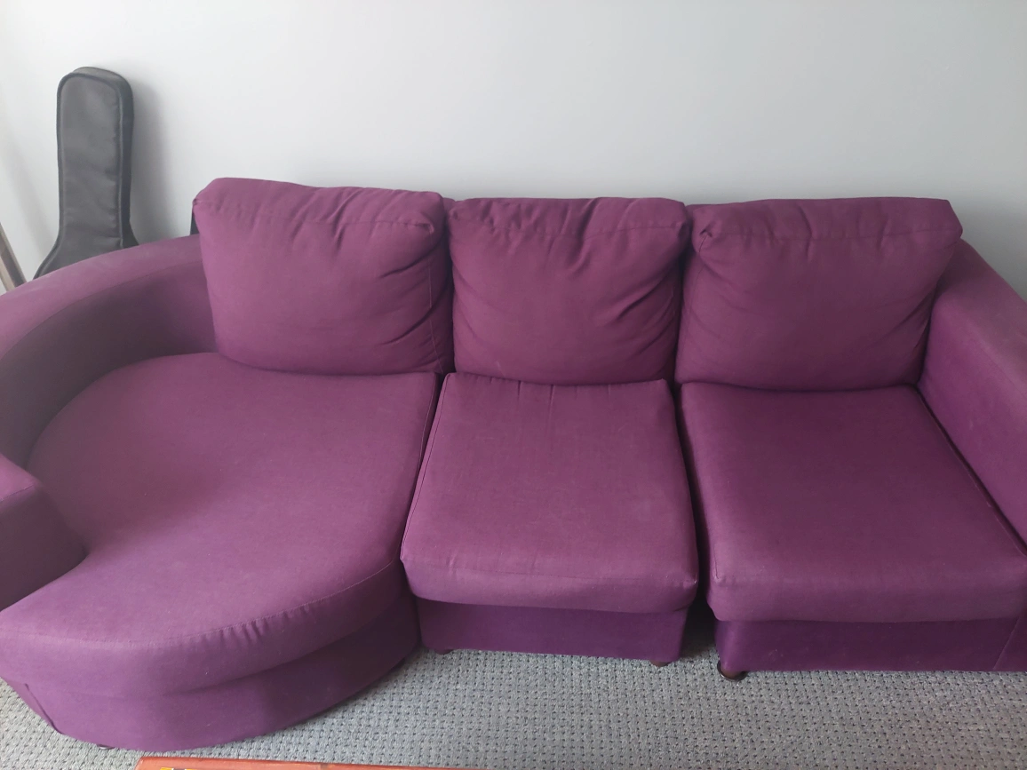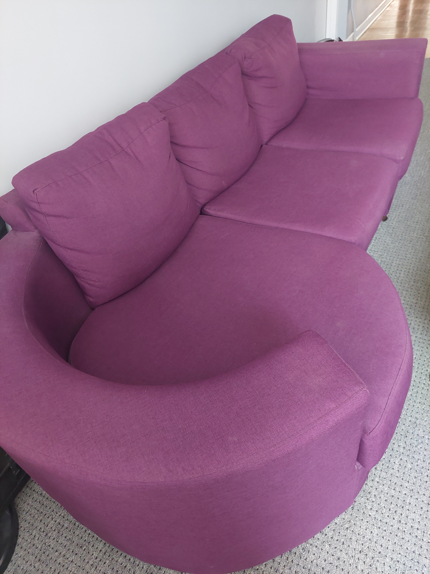 Statement piece couch - large and great for hosting! Complete with a nesting chair, it's big enough for a person under 6'2" to lie down comfortably. Slight separation of 2/3 backrest cushions (pictured), but No tears. One connector is slightly off between the right side and middle sections. Smoke free, Pet free home.